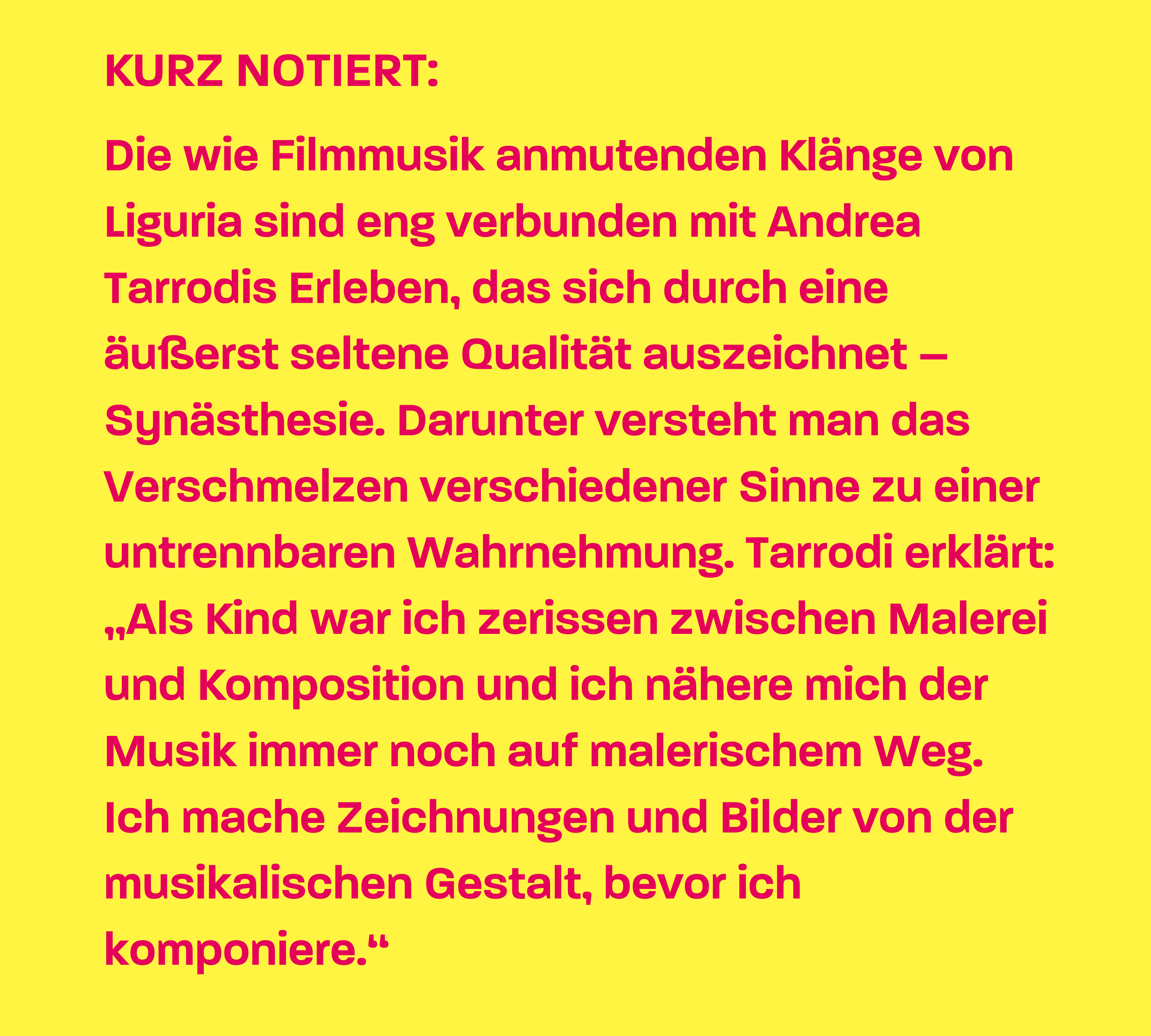 „An der Nordwestküste Italiens klammern sich 5 kleine Fischerdörfer an die ligurische Steilküste. Sie heißen Riomaggiore, Manarola, Corniglia, Vernazza und Monterosso und sind verbunden durch kleine Gebirgspfade. Bei unserer Ankunft dort wusste ich sofort, dass ich Musik über diesen Ort schreiben möchte.“ Was Tarrodi aus den Gerüchen, Klängen und Lichtbrechungen Liguriens destillierte, ist nach ihrer eigenen Aussage eine Wanderung entlang der Dörfer – sinfonische Zeichnungen mit präziser Schraffierung und impressionistisch anmutenden Farbspielen.