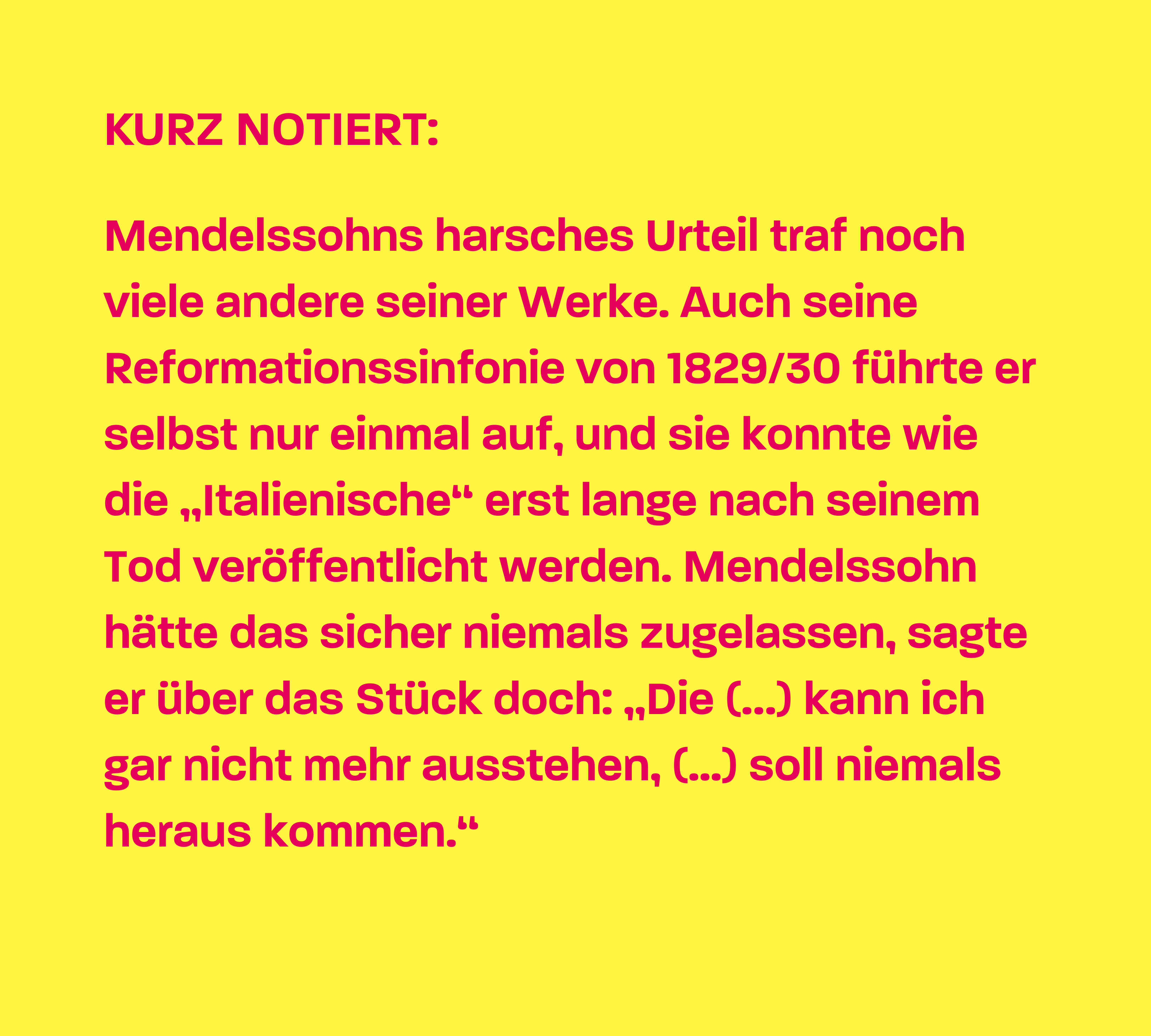 Nach Aufenthalten in Venedig und Florenz erreicht Mendelssohn im Herbst 1830 Rom, die Hauptstation seiner Reise. Von dem Musikleben der ewigen Stadt zeigt er sich wenig beeindruckt, einzig das Eintreffen von Hector Berlioz aus Paris im Frühjahr 1831 sorgt für eine künstlerisch-intellektuelle Begegnung auf Augenhöhe. Doch allein die Atmosphäre vor Ort bietet Inspiration im Überfluss und lässt in ihm unter anderem das Konzept für eine neue Sinfonie heranreifen, die er seiner Schwester Fanny brieflich als „das lustigste Stück, was ich je gemacht habe“ ankündigt. Aber das „lustige Stück“ musste auf seinem Weg in die Konzertsäle erst einen schwierigen Gegner überwinden – die unerbittliche Selbstkritik des Komponisten.
