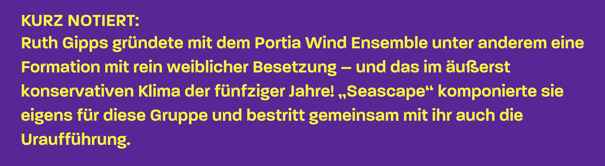 Schon seit einiger Zeit erfahren viele lang ignorierte Frauenfiguren der Musikgeschichte einen Zuwachs an Interesse, und Musiker:innen wie Publikum entdecken nach und nach die zahllosen Schätze, die diese Vorkämpferinnen unter oftmals widrigen Umständen geschaffen haben. Ruth Gipps muss als eine ebensolche Vorkämpferin betrachtet werden, wobei ihre enorme Begabung schon früh zu außergewöhnlichen Leistungen führte, aber auch das Risiko einer gewissen Vereinsamung mit sich brachte. Das Wunderkind musikalischer Eltern fand in der Grundschule wenig Anschluss, wurde schließlich daheim unterrichtet und mit nur 15 Jahren Studentin am Royal College of Music in London, wo sie parallel als Komponistin, Oboistin und Pianistin ausgebildet wurde. 1944 wurde sie Solo-Oboistin im Birmingham Symphony Orchestra und war dort ein Jahr später im Sinfoniekonzert nicht nur als Klaviersolistin zu erleben, sondern beteiligte sich am Englischhorn außerdem noch an der Aufführung ihrer eigenen ersten Sinfonie! So viel weibliches Talent in einem männlich dominierten Bereich zog neben Bewunderung sicher auch einiges an Feindseligkeit auf sich.