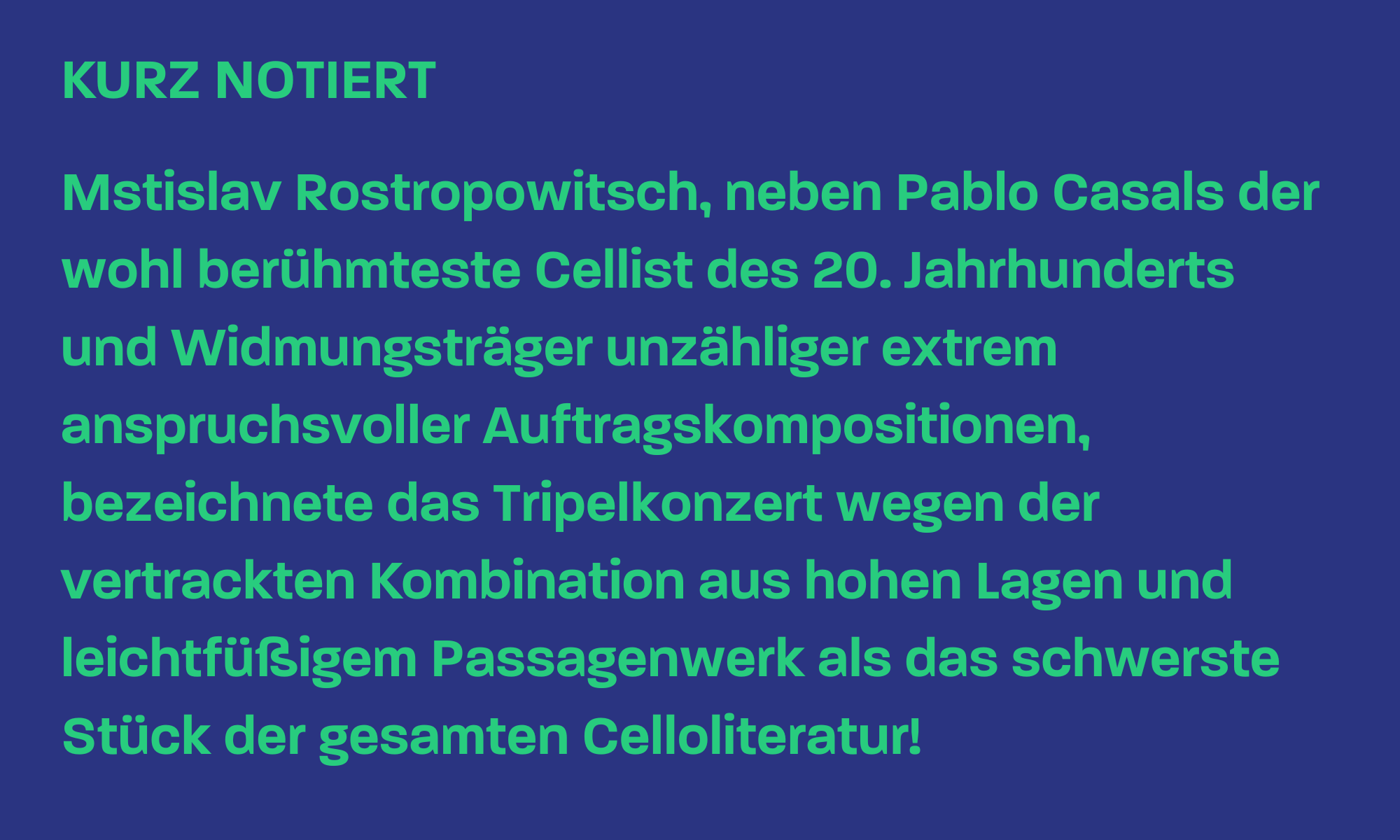 Wie dem auch sei, der Beginn des Konzerts lässt jedenfalls aufhorchen: Ganz behutsam stiehlt sich das noble Hauptthema auf die Szene und lässt eine Atmosphäre freudiger Erwartung entstehen. Nachdem das Orchester die beiden Themen vorgestellt hat, offenbart sich das Cello als führende Figur in der Riege der drei Virtuosen, wenn es – wie in den anderen beiden Sätzen auch – als erstes Soloinstrument erklingt. Dass es dabei fast sofort in einer außergewöhnlich hohen Lage agieren muss, entpuppt sich für dieses Stück als Regelfall. Immer wieder lässt Beethoven das Cello in einer Region spielen, die nach den Standards der damaligen Zeit unerhört war. Ein weiterer Grund für die eher geringe Popularität des Werkes mag also auch bei den technischen Herausforderungen liegen.