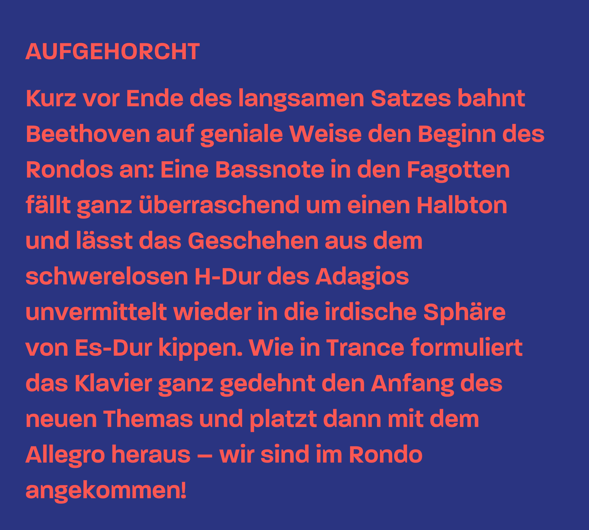 Dass die Besetzung diesmal nun denkbar klassisch ist, hindert Beethoven jedoch keinesfalls am Experiment. Er beginnt sogar mit einer Innovation, wenn er die eigentlich für das Ende eines Satzes vorgesehene Solokadenz zu einem mächtigen Eingangsportal umfunktioniert, das er der Orchestereinleitung voranstellt. War der Grundgestus im Tripelkonzert eher lyrisch, so dominiert hier ein beinahe militärischer Ton in dem von Beethoven selbst oft als Heldentonart eingesetzten Es-Dur — nicht von ungefähr erhielt das Konzert in England den Beinamen „Emperor“. Dagegen wirkt der zweite Satz umso mehr wie eine entfernte Vision, ganz losgelöst von jedem irdischen Geschehen. Es folgt ein auftrumpfendes Rondo, dessen Thema wohl das berühmteste des ganzen Konzerts ist: Die Musik scheint sich vor lauter Überschwang selbst überholen zu wollen, stürmt voller Freude vorwärts, und der Klavierpart schwelgt in Virtuosität. Mit einer letzten aberwitzigen Passage droht der Solist fast über den oberen Rand der Klaviatur zu rauschen, bevor das Orchester mit knackigen Akzenten den Vorhang fallen lässt.