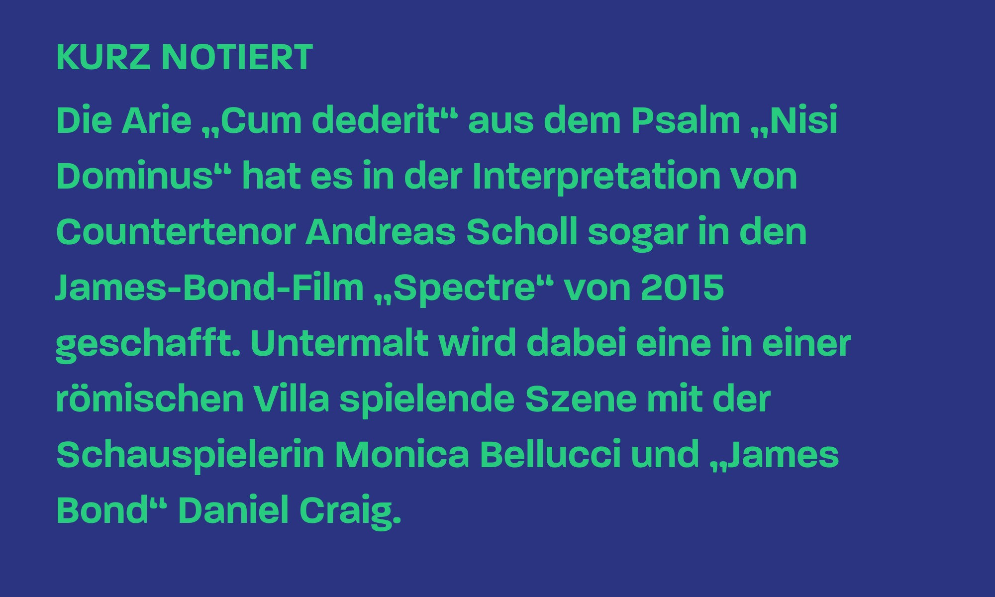 Für die kirchenmusikalische Praxis am Ospedale della Pietà schuf Vivaldi eine Reihe von Psalmkompositionen, darunter auch Nisi Dominus (RV 608). Angelegt ist das Stück als neunsätzige Kantate für Alt-Solo und Streichorchester mit großer Abwechslung und Sinn für das vertonte Wort. Auf den brillanten, schwungvollen Eingangssatz folgt ein ruhiger, sanfter Abschnitt, in dem die Altstimme lediglich vom Basso continuo begleitet wird („Vanum est vobis“). Seinen größten Ausdruck erreicht Vivaldi in dem Satz „Cum dederit“, einer unvergleichlich suggestiven Darstellung des Schlafes („Denn der Herr gibt es den Seinen im Schlaf“). Gleich danach überrascht Vivaldi wieder mit einem völlig kontrastierenden Effekt, wenn Unisono-Linien der Streicher die im Text erwähnten fliegenden Pfeile imitieren („Sicut sagittae“). Schließlich endet die Psalmvertonung noch mit einer ungewöhnlichen Instrumentalfarbe, indem eine Viola d’amore den Beginn der Doxologie „versilbert“.