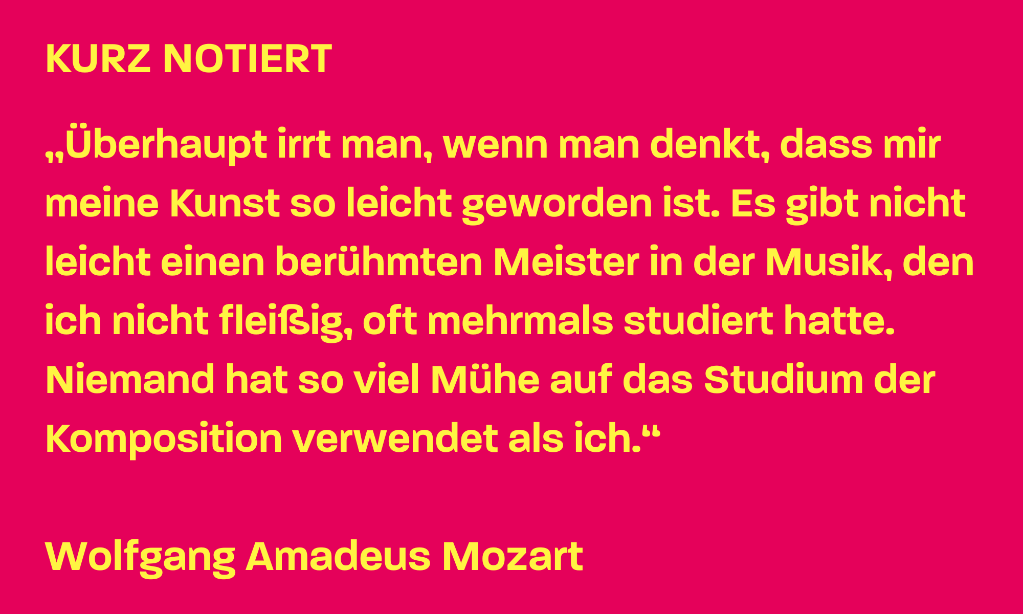 Die folgenden Monate waren an Eindrücken kaum zu übertreffen: Das jugendliche Ausnahmetalent schrieb sein erstes Streichquartett und andere Werke wie z.B. die Oper „Mitridate, Re di Ponto“, die dann am 26. Dezember 1770 mit großem Erfolg in Mailand uraufgeführt wurde. Konzert folgte auf Konzert. Auftritte bei Adel und Diplomatie wurden abgelöst von Ausflügen, etwa nach Herculaneum und Pompeji, dessen systematische Erforschung damals gerade begonnen hatte. In Rom gehörte eine Privataudienz beim Papst zum Programm, und in Bologna absolvierte Mozart intensive Studien bei Padre Giovanni Battista Martini, einem der bedeutendsten Kontrapunktlehrer seiner Zeit.
