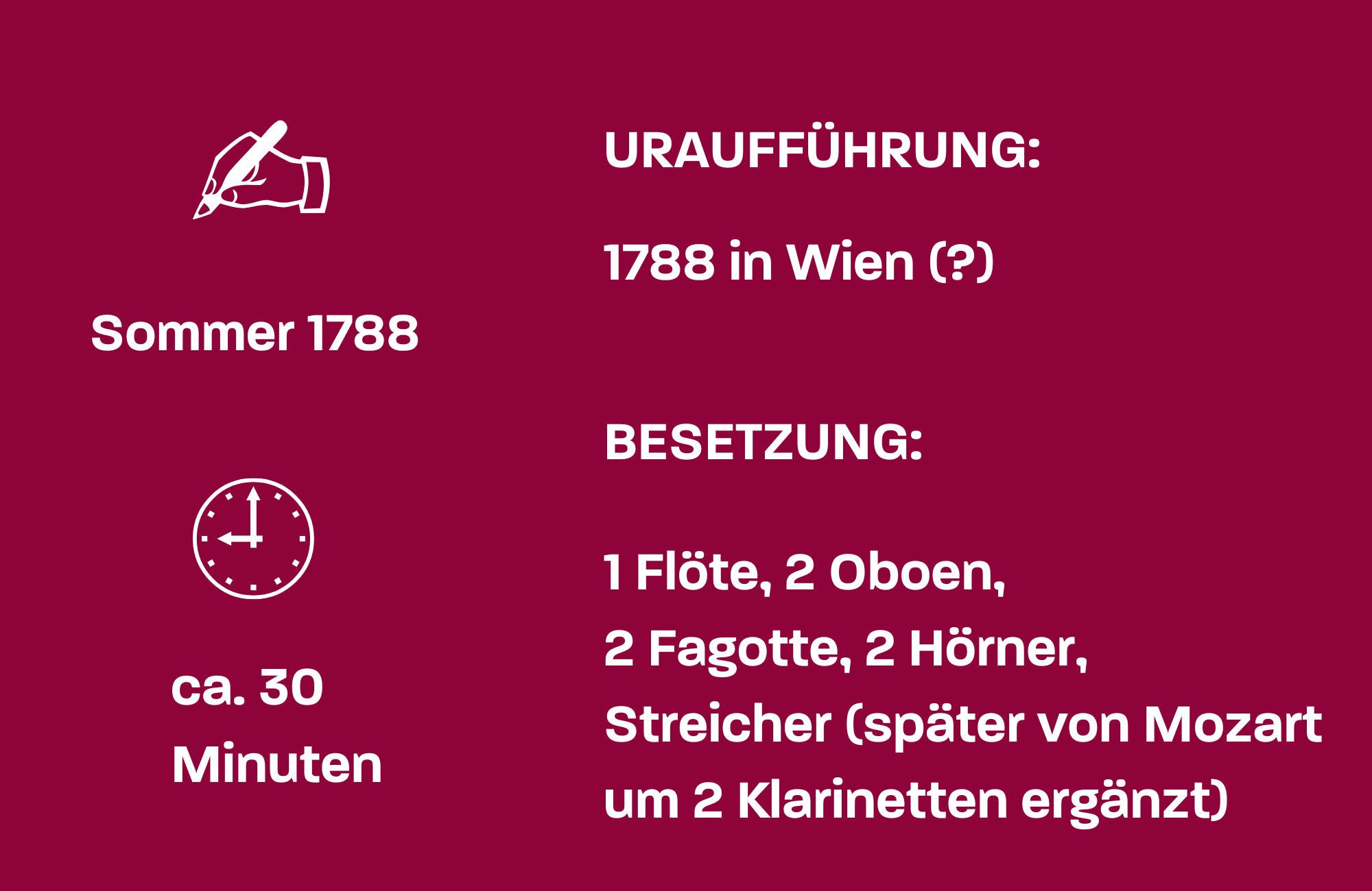 Und doch verstummte Wolfgang Amadeus Mozart nicht – im Gegenteil. Zwischen dem 26. Juni und dem 10. August 1788 komponierte er drei sinfonische Werke: eine Sinfonie in Es-Dur (KV 543), eine in C-Dur („Jupiter“ KV 551) und die am heutigen Abend erklingende in g-Moll (KV 550), die er am 25. Juli 1788 in sein vier Jahre zuvor angelegtes „Verzeichnüß“ eintrug: „Eine Sinfonie. – 2 violini, 1 flauto, 2 oboe, 2 fagotti, 2 Corni, 1 viola e Baßo“. Später erweiterte er diese Besetzung noch um zwei Klarinetten. Es handelt sich um sein 40. und vorletztes sinfonisches Werk, auch „große“ g-Moll-Sinfonie genannt, um sie vom 15 Jahre zuvor entstandenen tonartgleichen „kleinen“ Schwesterwerk KV 183 zu unterscheiden.
