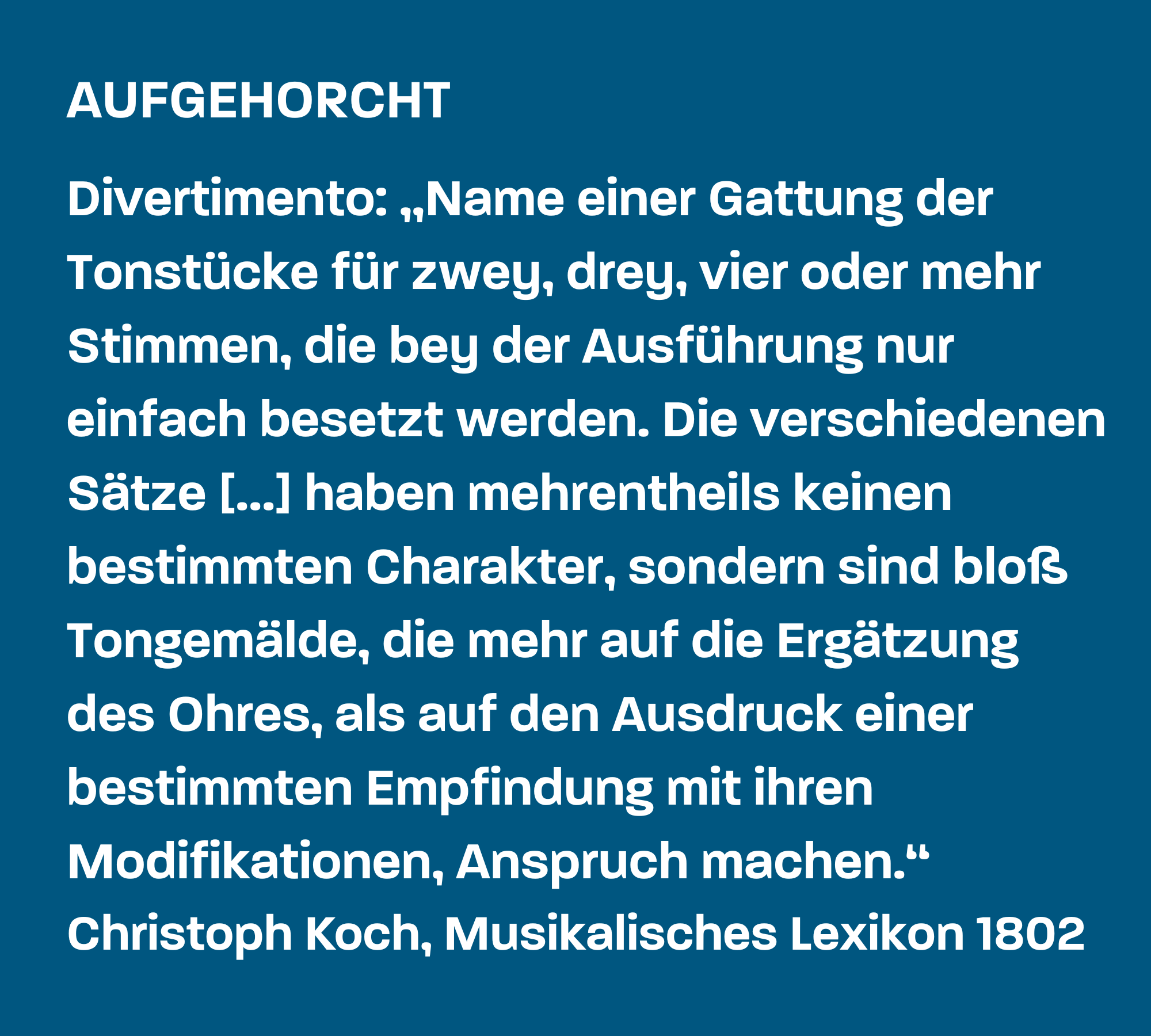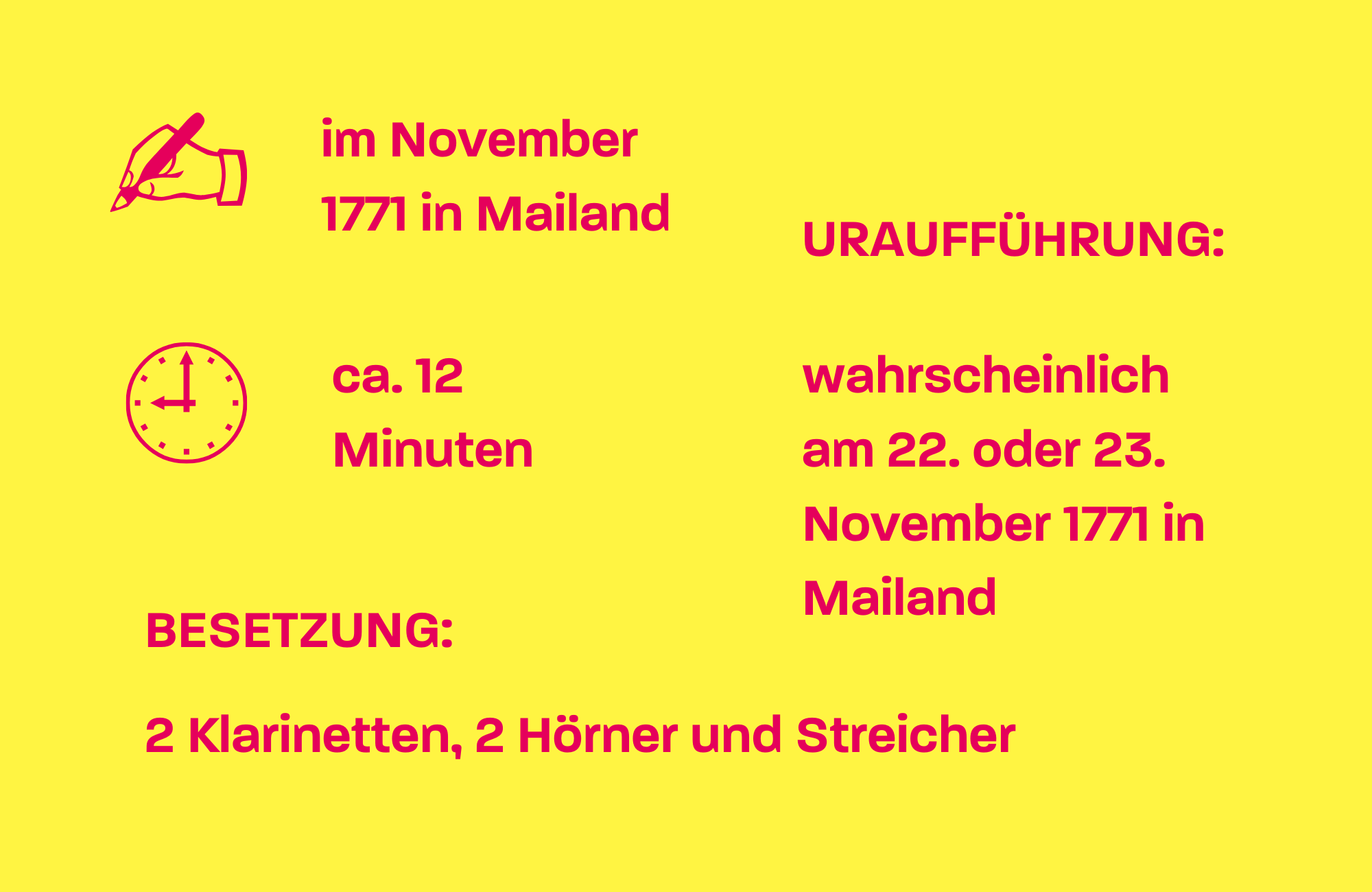 Auch im folgenden Jahr verbrachte Mozart, nach einer gut vier Monate währenden Pause in Salzburg, mit dem Vater einige Monate in Italien und feierte hier einen Erfolg nach dem anderen. Kein Wunder, dass er, inzwischen 15 Jahre alt, „keine lust mehr auf [das zunehmend als engstirnig und provinziell empfundene] salzburg“ hatte, wie er am 21. September von Mailand aus an die Schwester Nannerl schrieb. Mailand war der bevorzugte Aufenthaltsort dieser zweiten Italienreise Mozarts. Hier entstand – wahrscheinlich für ein Konzert am 22. oder 23. November 1771 – das Divertimento Es-Dur KV 113. Dass Leopold Mozart anschließend berichtet hat, „gestern machten wir eine starke Musik“, gilt als Hinweis für die Aufführung der neuen Komposition in Mailand. Ihr Titel weist sie einer der wichtigsten Gattungen der Kammermusik vor der Herausbildung des klassischen viersätzigen Streichquartetts zu.