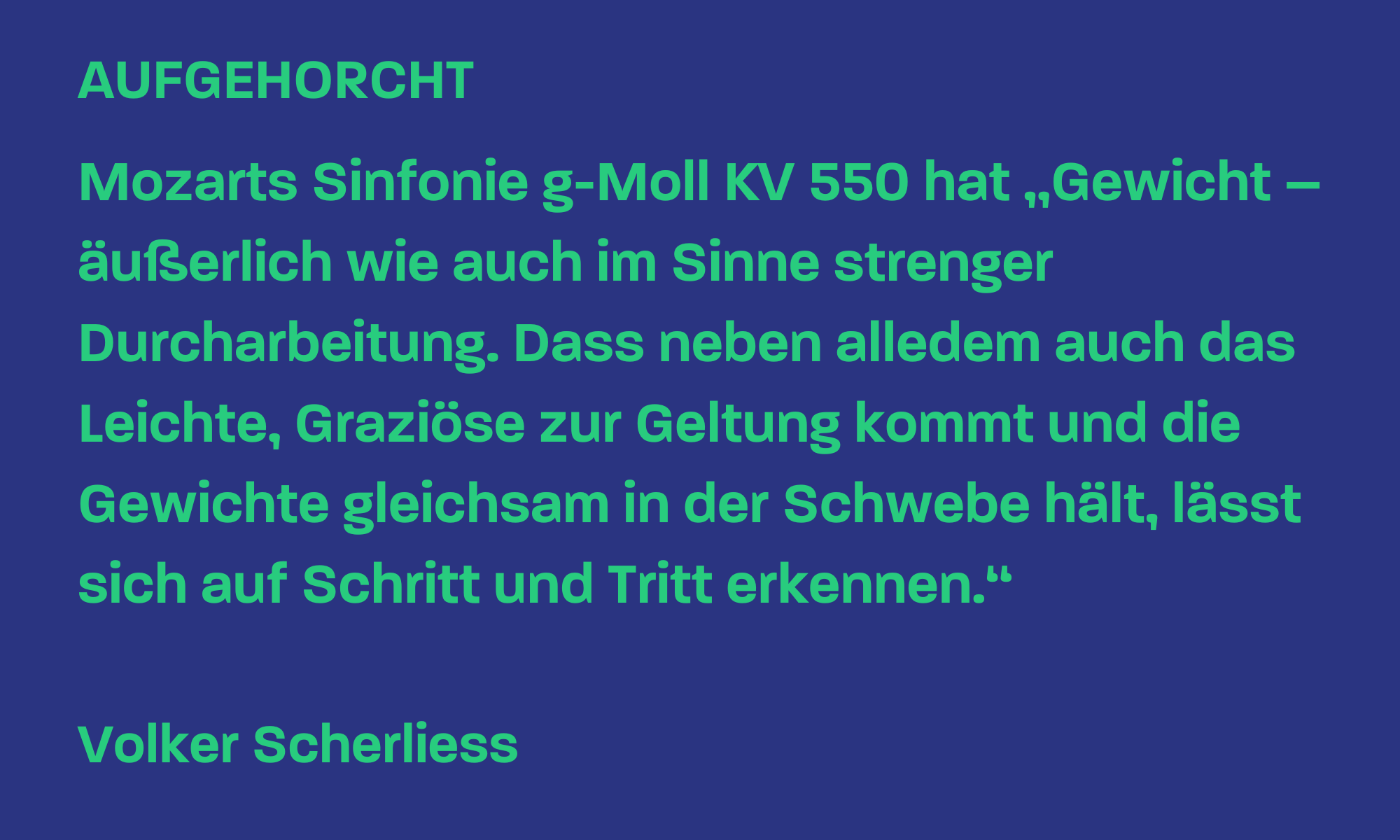 Keine Frage: Die Umstände, unter denen die Sinfonie g-Moll KV 550 entstanden ist, warnen nachdrücklich davor, einen unmittelbaren Zusammenhang zwischen Biografie und Werk zu konstruieren. Halten wir uns also an die Musik. Hier regieren – abgesehen von Ausnahmen wie dem G-Dur-Trio des 3. Satzes – Tragik, Schmerz und Klage, Resignation und Melancholie. Pauken und Trompeten als traditionelle Attribute äußerlichen Glanzes sucht man vergeblich. Dafür von Beginn an: rastlose Bewegung und erregte Unruhe. Und meisterlich verarbeitete, zu Herzen gehende, leicht fassliche Themen. „Mozart“, hat der italienische Komponist Muzio Clementi einmal im Hinblick auf diese Sinfonie geschrieben, „hat die Grenzen der Musik erreicht und sich drübergeschwungen, die alten Meister, die Modernen und die Nachwelt selbst hinter sich lassend“. Dem ist nichts hinzuzufügen.