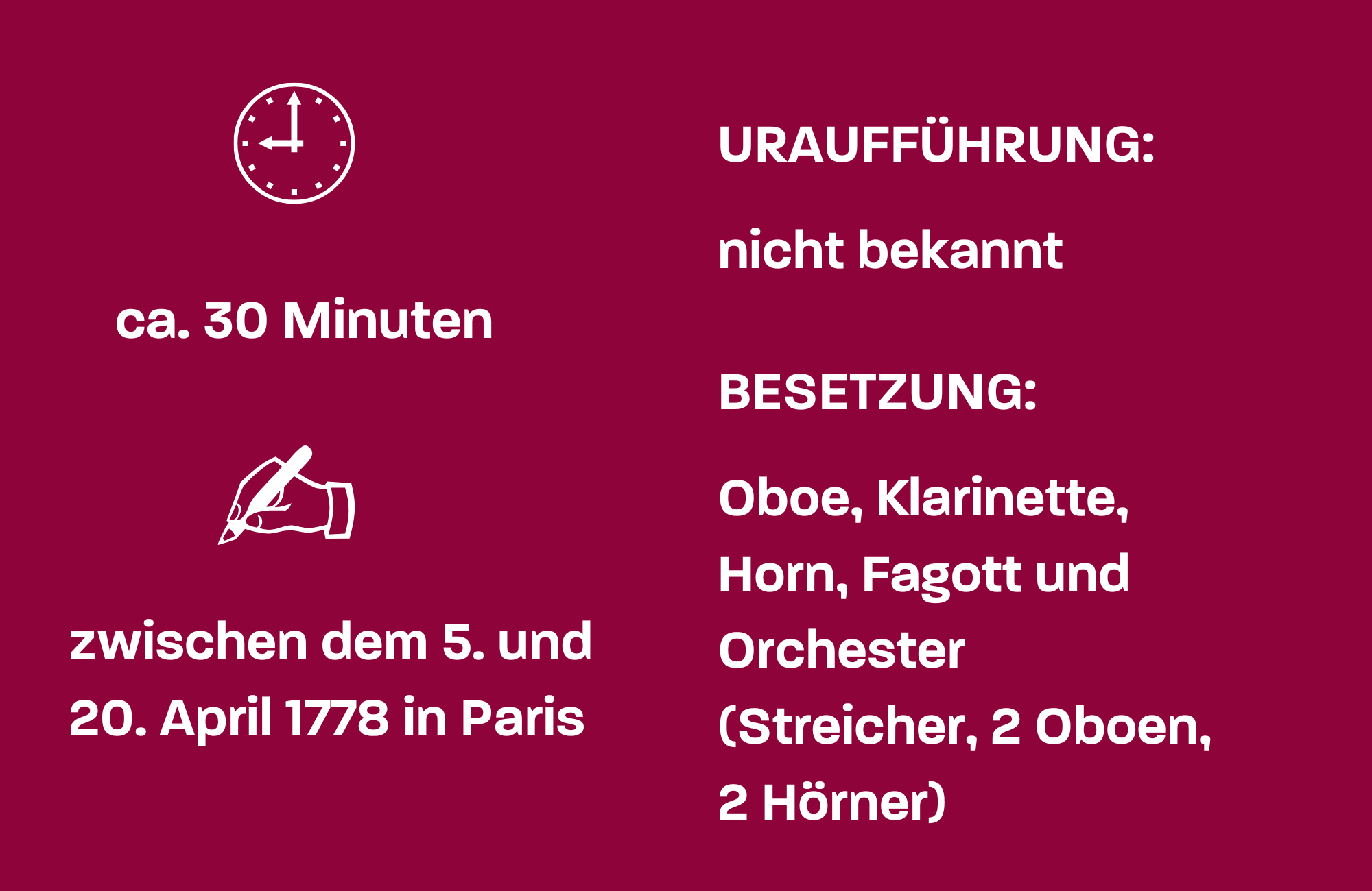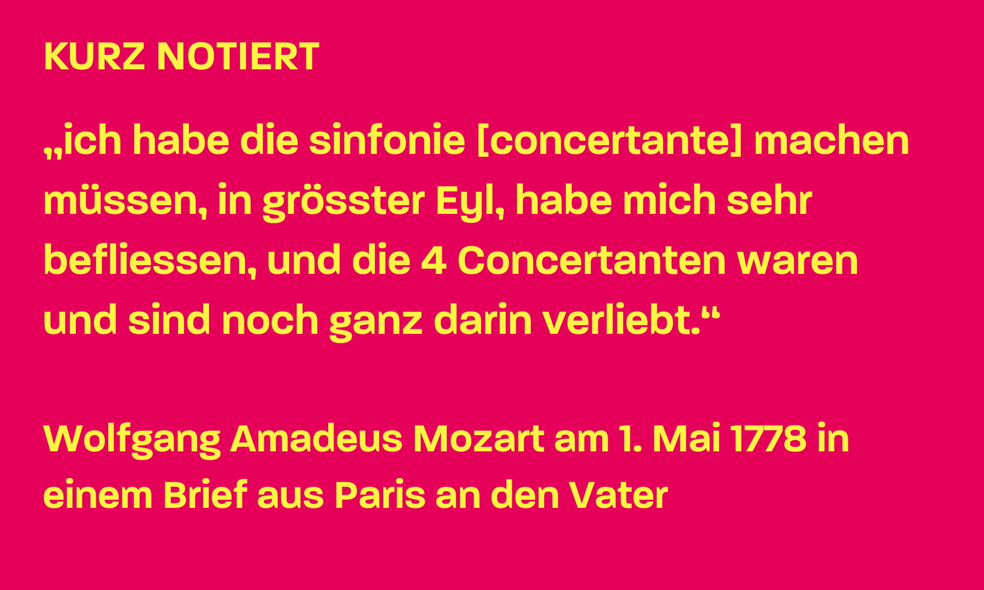 Was für ein Lichtblick, dass der Direktor der 1725 gegründeten Pariser Konzertreihe „Concerts spirituels“ Joseph Le Gros ihn in dieser Situation bat, eine Sinfonia concertante zu komponieren. Diese Gattung – ein meist dreisätziges Konzert in der Tradition des Concerto grosso – war neu und damals in Paris sehr beliebt. Nach Solisten für das neue Werk musste Mozart nicht lange suchen. Hielten sich doch gerade vier mit ihm befreundete Mannheimer Musiker in Paris auf: Johann Baptist Wendling (Flöte), Friedrich Ramm (Oboe), Jan Václav Štich, genannt Punto (Horn) und Georg Wenzel Ritter (Fagott). Am 20. April 1778 war die Partitur fertig und wechselte gegen ein vereinbartes Honorar in den Besitz von Le Gros. Nun mussten für die geplante Aufführung nur noch Abschriften der virtuosen Bläserstimmen angefertigt werden.