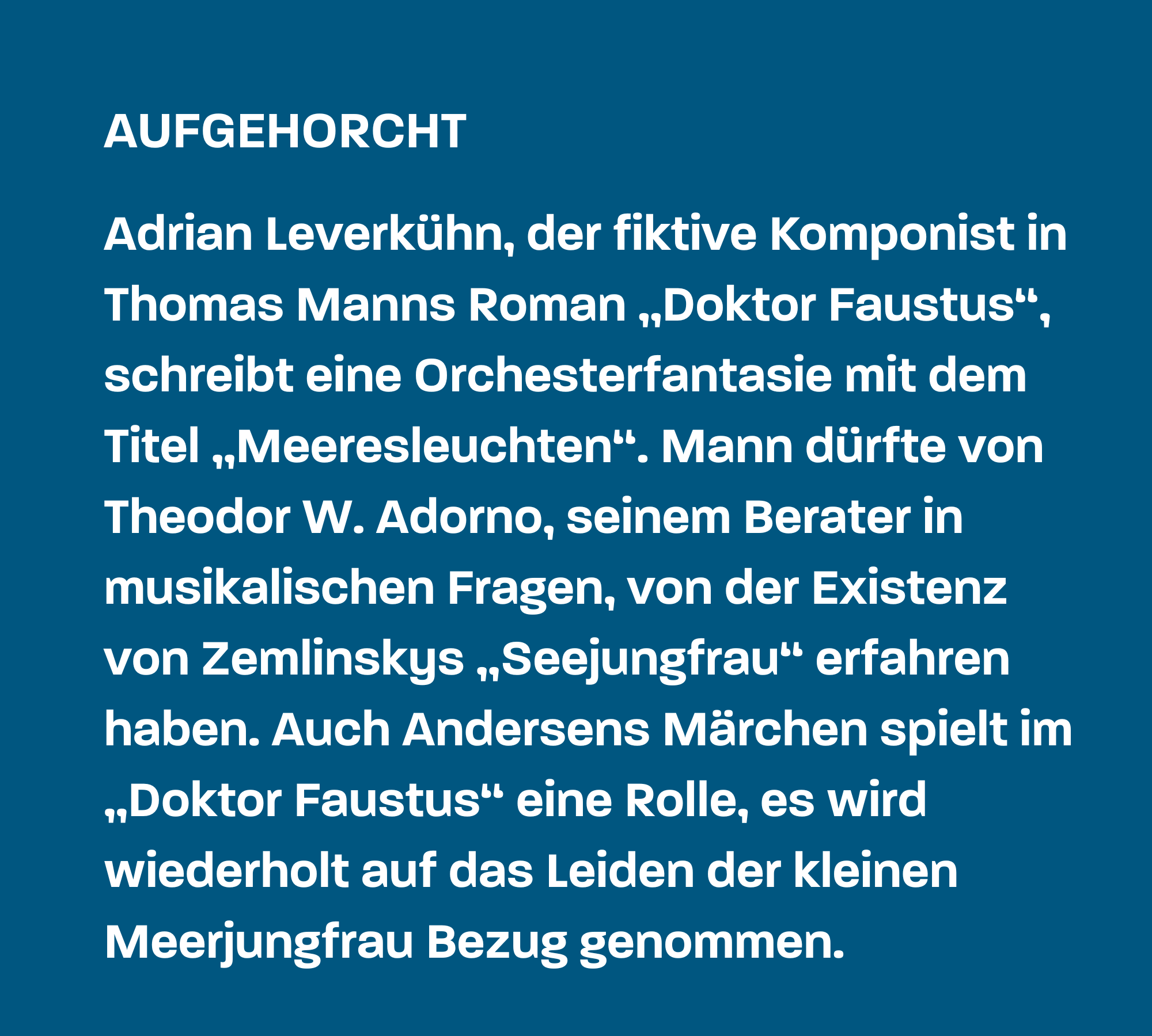Alexander von Zemlinskys Tondichtung „Die Seejungfrau“ führt uns in das wirkliche Meer, das von der Musik virtuos und eindrücklich geschildert wird. Im Vordergrund steht allerdings die tragische Geschichte von der Seejungfrau, die sich danach sehnt, ein Mensch zu werden, um den von ihr geliebten Prinzen heiraten zu können. Zemlinskys brillanter Orchestersatz hüllt das Geschehen in ein berückendes Klanggewand.