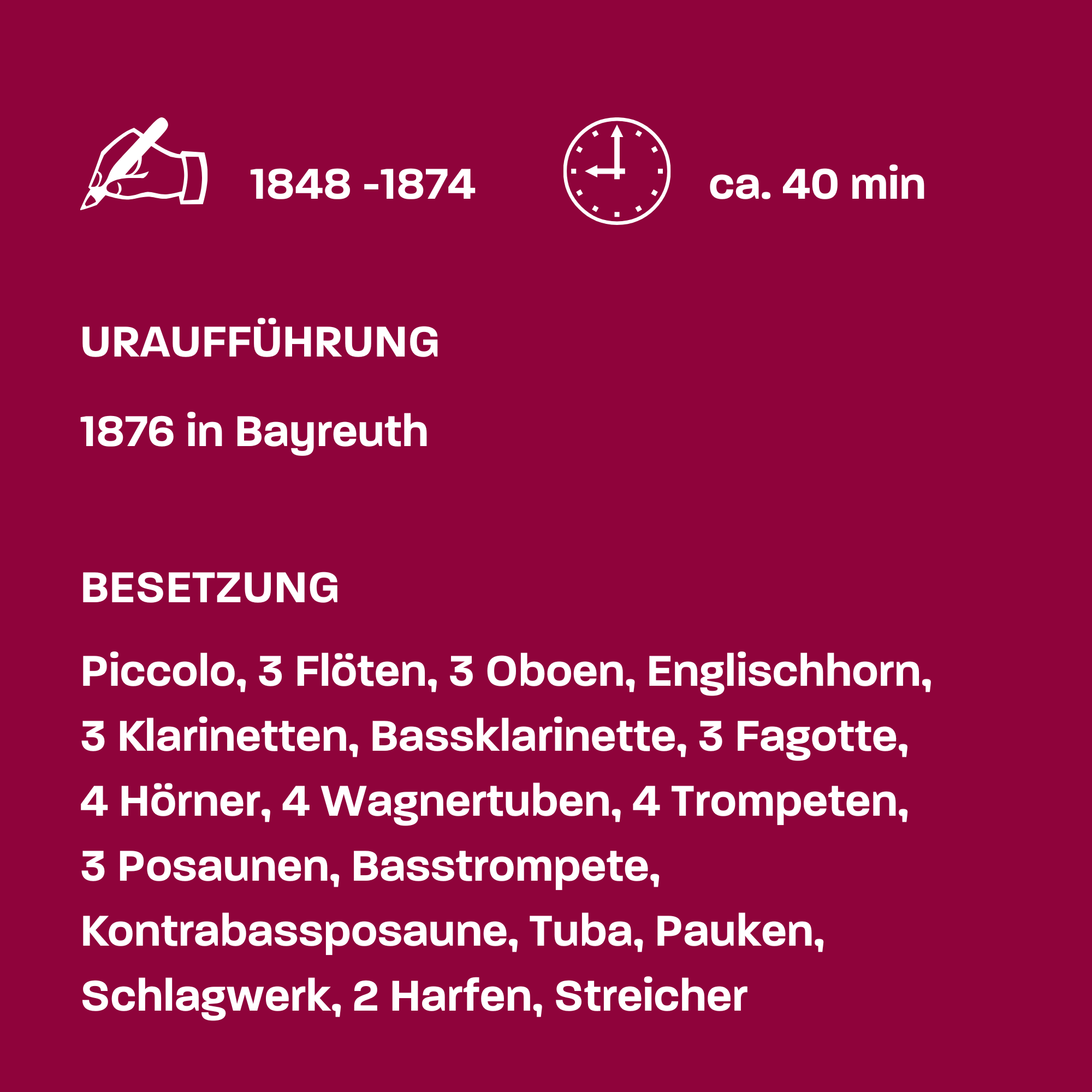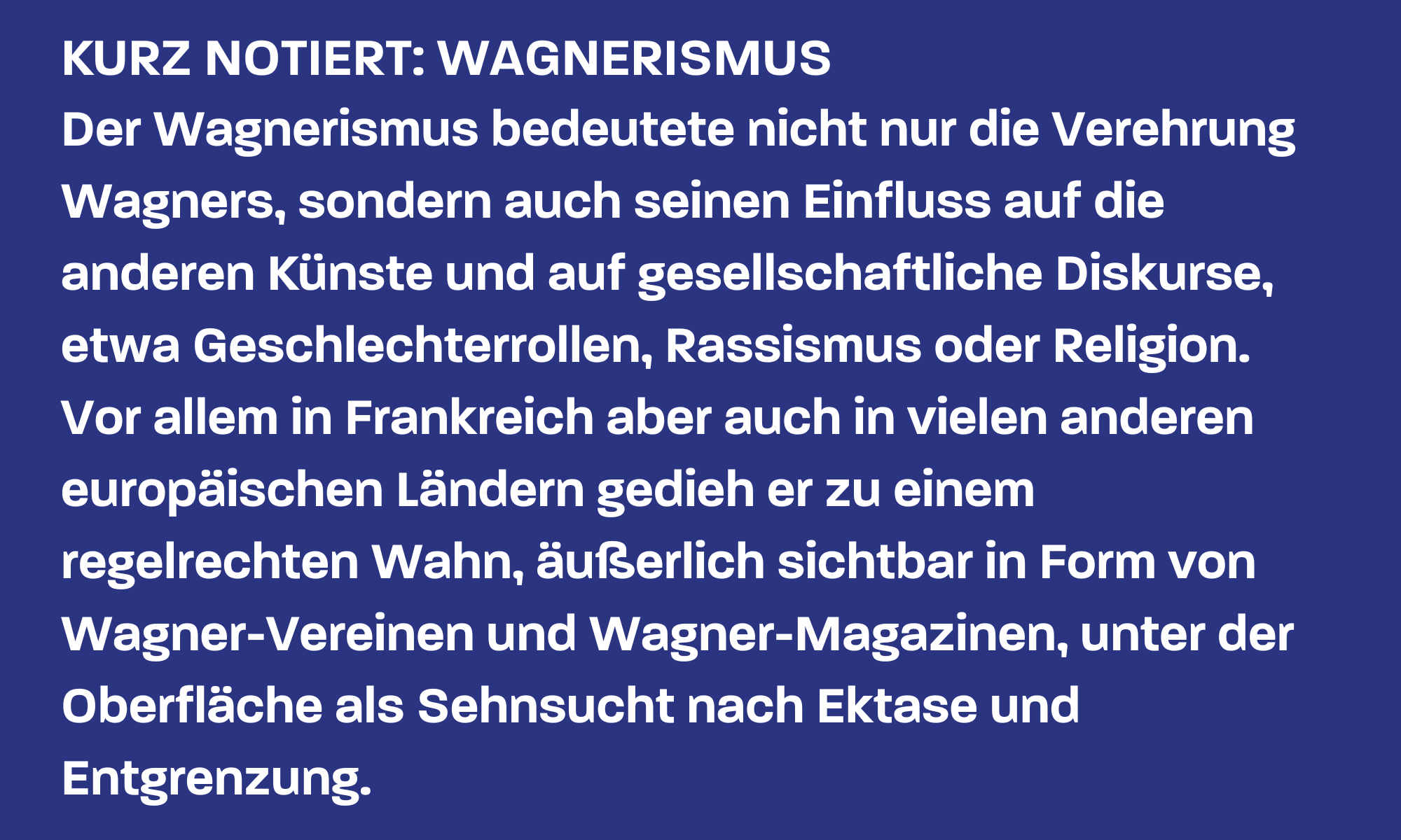 So abstoßend Wagners Persönlichkeit in vieler Hinsicht sein mag, so faszinierend, verführerisch und genial bleibt (leider, möchte man fast sagen) seine Musik. 1874 brachte er in Bayreuth seinen monumentalen Ring-Zyklus auf die Bühne und schrieb damit mehr als nur Musikgeschichte: Der sogenannte Wagnerismus gedieh zu einem gesamtgesellschaftlichen Phänomen in vorher nicht gekanntem Ausmaß. Bis heute ist Wagner vermutlich die Person, über die nach Jesus und Napoleon insgesamt am meisten geschrieben wurde. In jedem Fall gibt es über keinen Komponisten sonst annähernd so viel Literatur.