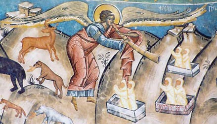 „Und ich sah: Ein anderer gewaltiger Engel kam aus dem Himmel herab; er war von einer Wolke umhüllt und der Regenbogen stand über seinem Haupt. Sein Gesicht war wie die Sonne und seine Beine waren wie Feuersäulen. In der Hand hielt er ein geöffnetes kleines Buch. Er setzte seinen rechten Fuß auf das Meer, den linken auf das Land. (…) Und der Engel, den ich auf dem Meer und auf dem Land stehen sah, erhob seine rechte Hand zum Himmel. Er schwor bei dem, der in alle Ewigkeit lebt, der den Himmel erschaffen hat und was darin ist, die Erde und was darauf ist, und das Meer und was darin ist: Es wird keine Zeit mehr bleiben, sondern in den Tagen, wenn der siebte Engel seine Stimme erhebt und seine Posaune bläst, wird auch das Geheimnis Gottes vollendet sein; so hatte er es seinen Knechten, den Propheten, verkündet.“