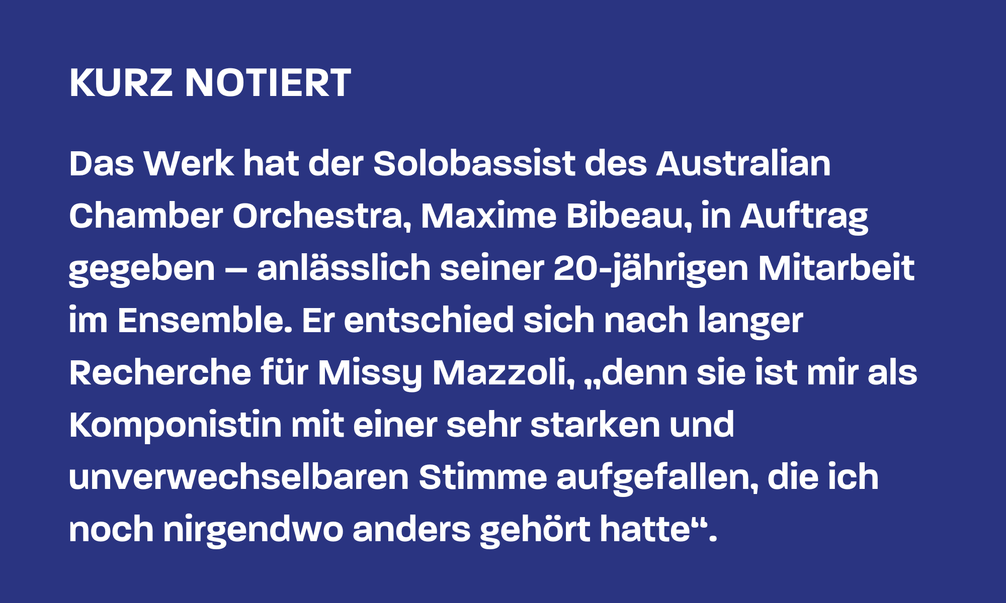 Missy Mazzoli sieht in dieser Beschreibung des hell strahlenden Dunkels eine Analogie auf den Klang des Solo-Instruments in ihrem Werk: „Ich liebe die Unmöglichkeit dieses Satzes und finde, dass er auf seltsame Weise den dunklen, aber herzzerreißenden Klang des Kontrabasses selbst treffend beschreibt.“ Inspiriert hat sie neben dem Text dabei ein konkretes Instrument: der im 16. Jahrhundert gebaute Kontrabass des Interpreten Maxime Bibeau. Sein Korpus, seine Saiten werden in Mazzolis Werk zu Botschafterinnen, zu weisen Zeugen einer vergangenen Zeit: „Ich stelle mir dieses Instrument als einen Historiker vor, als ein Objekt, das die Musik der vergangenen Jahrhunderte in den Windungen seines Halses und den Fasern seines Holzes gesammelt hat und sie schließlich im Alter von 400 Jahren in die Welt hinaus singt.“