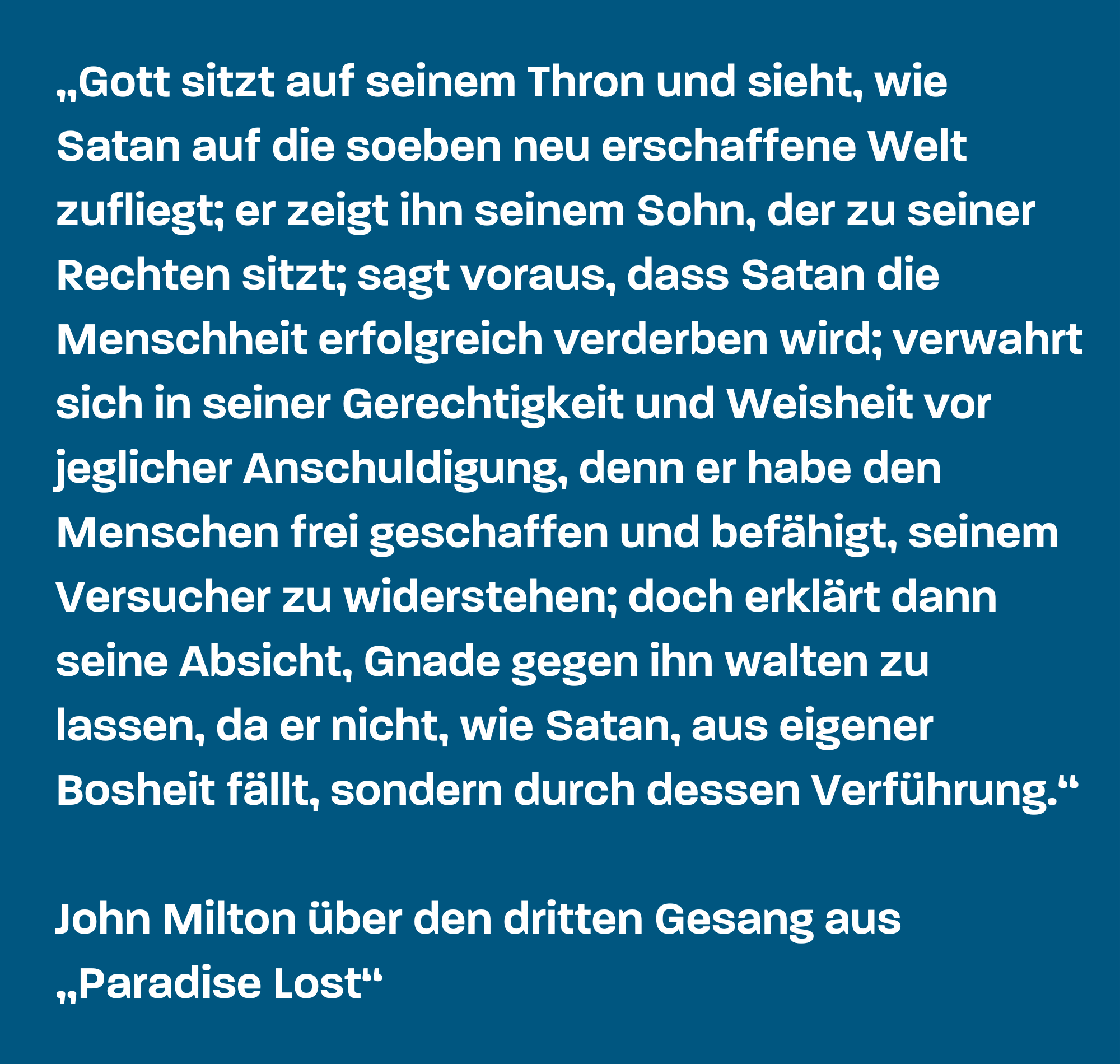 Als John Milton sein episches Gedicht „Paradise lost“ schreibt, ist er entmutigt: Dem überzeugten Anhänger der englischen Republik graut es vor der Restauration der Monarchie. Mit dem Tod des Lordprotektors Oliver Cromwell und der gescheiterten puritanischen Revolution im Jahr 1660 hatte sich seine gesellschaftspolitische Utopie zerschlagen, sein Paradies war verloren – der vollständig erblindete Dichter fand sich nunmehr nicht nur buchstäblich in einer dunklen Welt wieder, sondern auch symbolisch, gesellschaftlich.