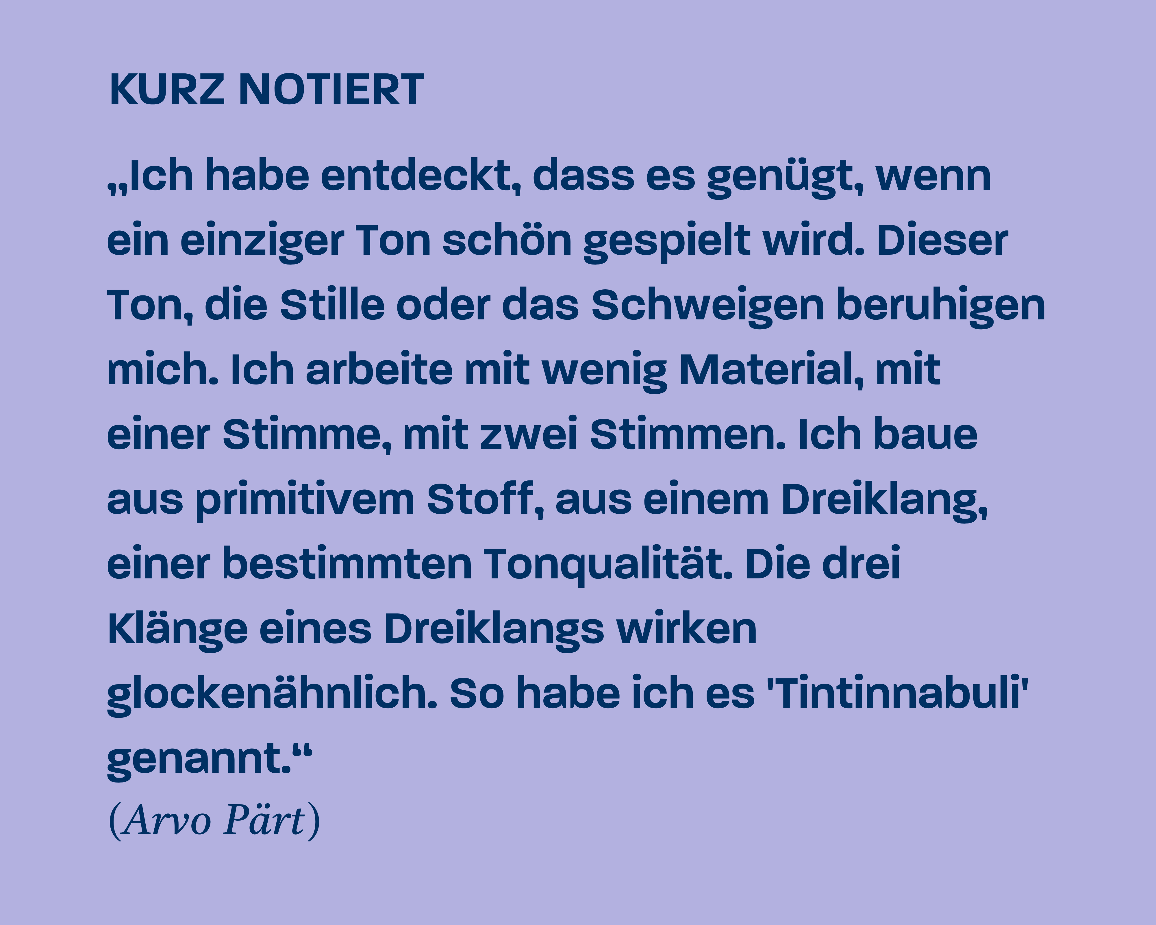1935 in Paide (Estland) geboren, hatte Arvo Pärt am Konservatorium von Tallinn zunächst eine Tonmeisterausbildung absolviert und arbeitete danach mehrere Jahre am Estnischen Rundfunk. 1963 schloss er sein Kompositionsstudium bei Heino Eller in Tallinn ab und errang mit seinen Werken sehr schnell internationale Anerkennung. In den 1970er Jahren fand er nach intensiven Studien mittelalterlicher Musik zu einer stilistischen Neubesinnung als Komponist: Eine „Flucht in die freiwillige Armut“ nannte er seinen neuen Stil einer spirituellen Einfachheit, die viele seiner Werke seitdem auszeichnet. Ungeachtet der bescheidenen Selbsteinschätzung sind viele Werke Pärts von gedanklicher Größe und klanglicher Schönheit.