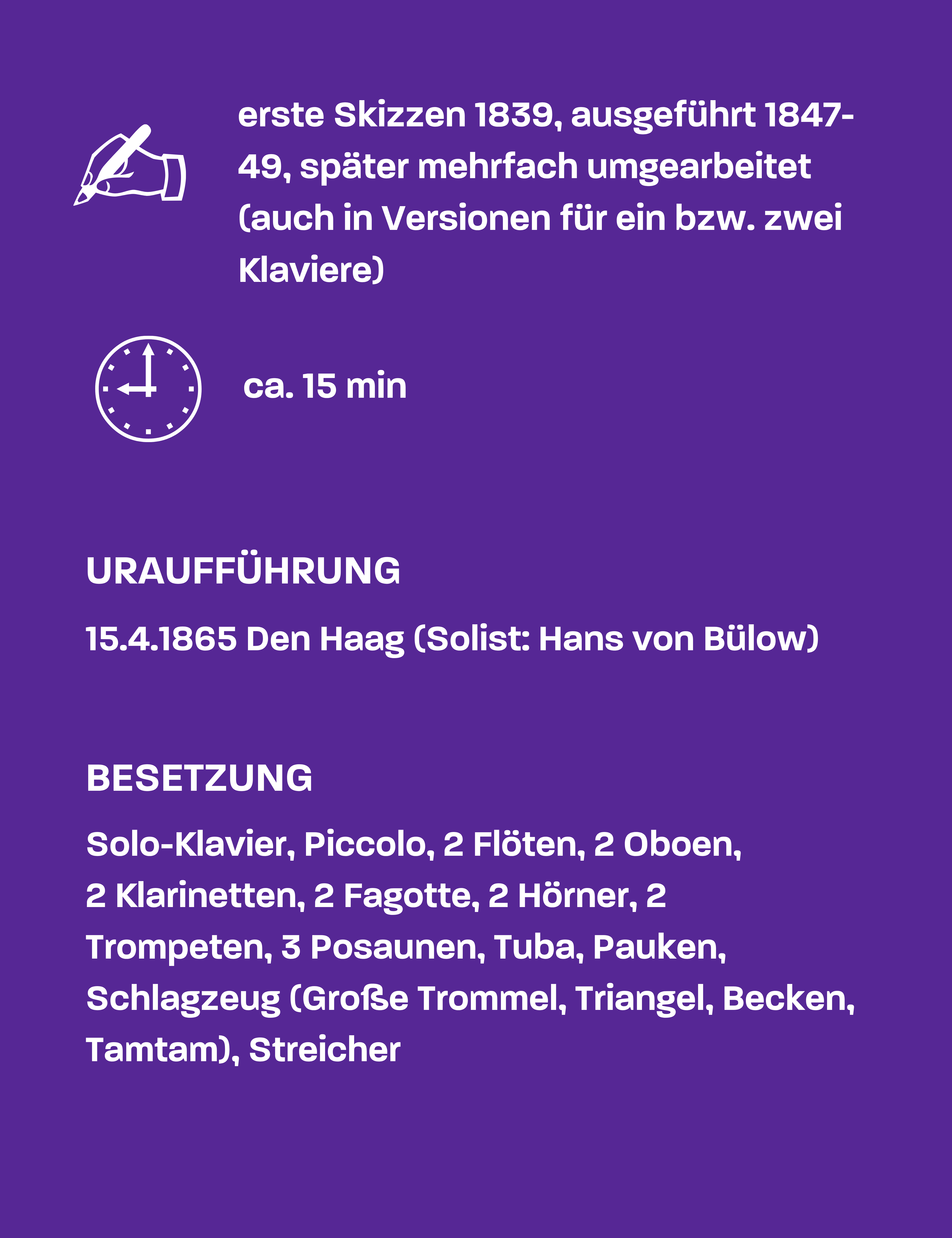 Neben den zwei Klavierkonzerten in Es-Dur und A-Dur hat Franz Liszt auch noch mehrere einsätzige Konzertstücke für Klavier und Orchester komponiert. Seiner „Danse macabre“, 1847-49 zunächst in zwei Fassungen für Klavier und Orchester entstanden, legte Liszt das gregorianische „Dies irae“ (aus der Liturgie der Gedächtnismesse für die Verstorbenen) einer Folge von Variationen zugrunde, in denen die Dämonie der Singweise durch die pianistische Virtuosität noch gesteigert wird. Eine erste Skizze des Werkes hatte Liszt bereits 1839 in Pisa, angeregt durch ein Wandgemälde „Der Triumph des Todes“ des Florentiner Künstlers Andrea Orcagna (um 1320-1368) auf dem dortigen Camposanto, zu Papier gebracht.