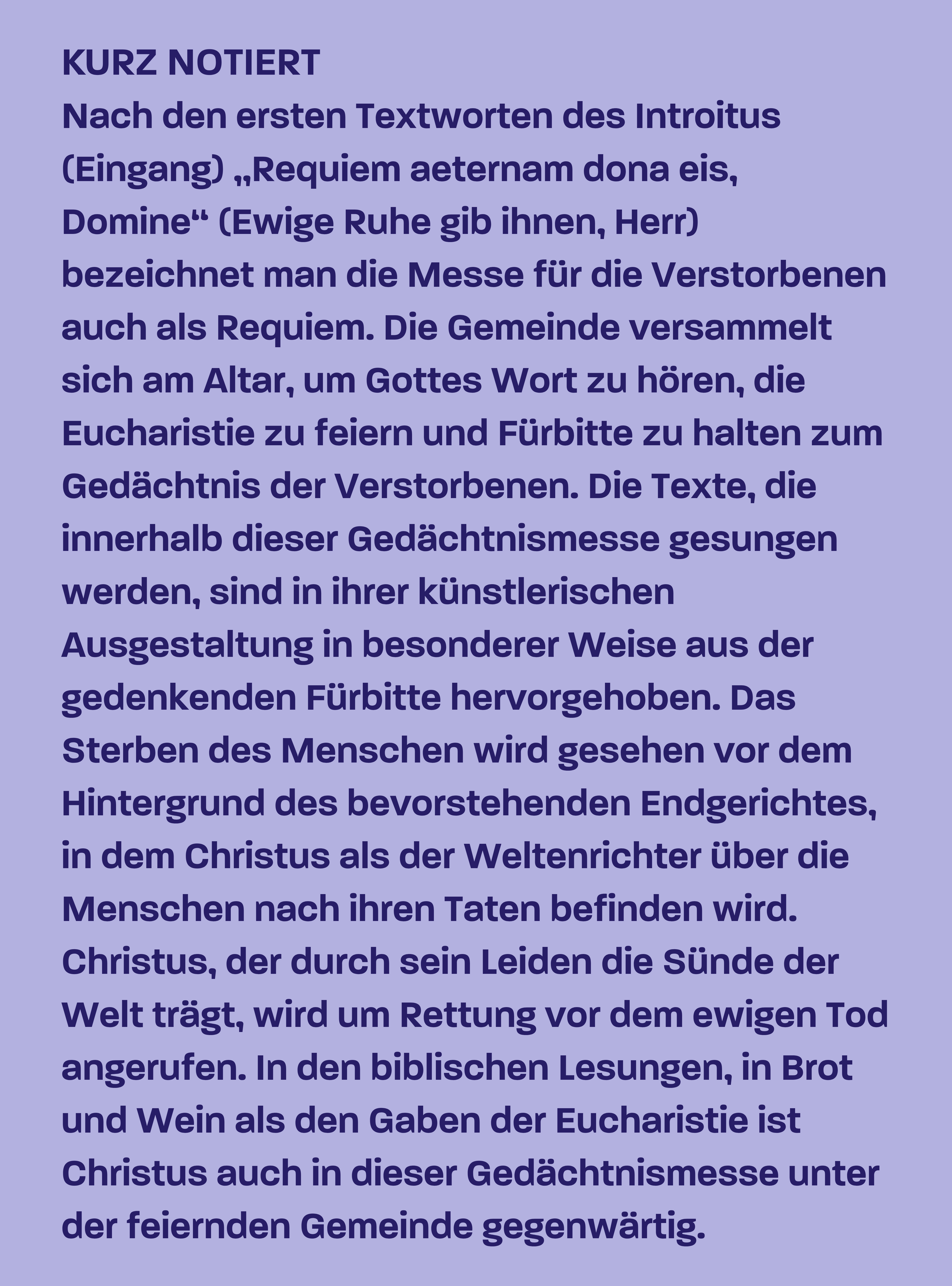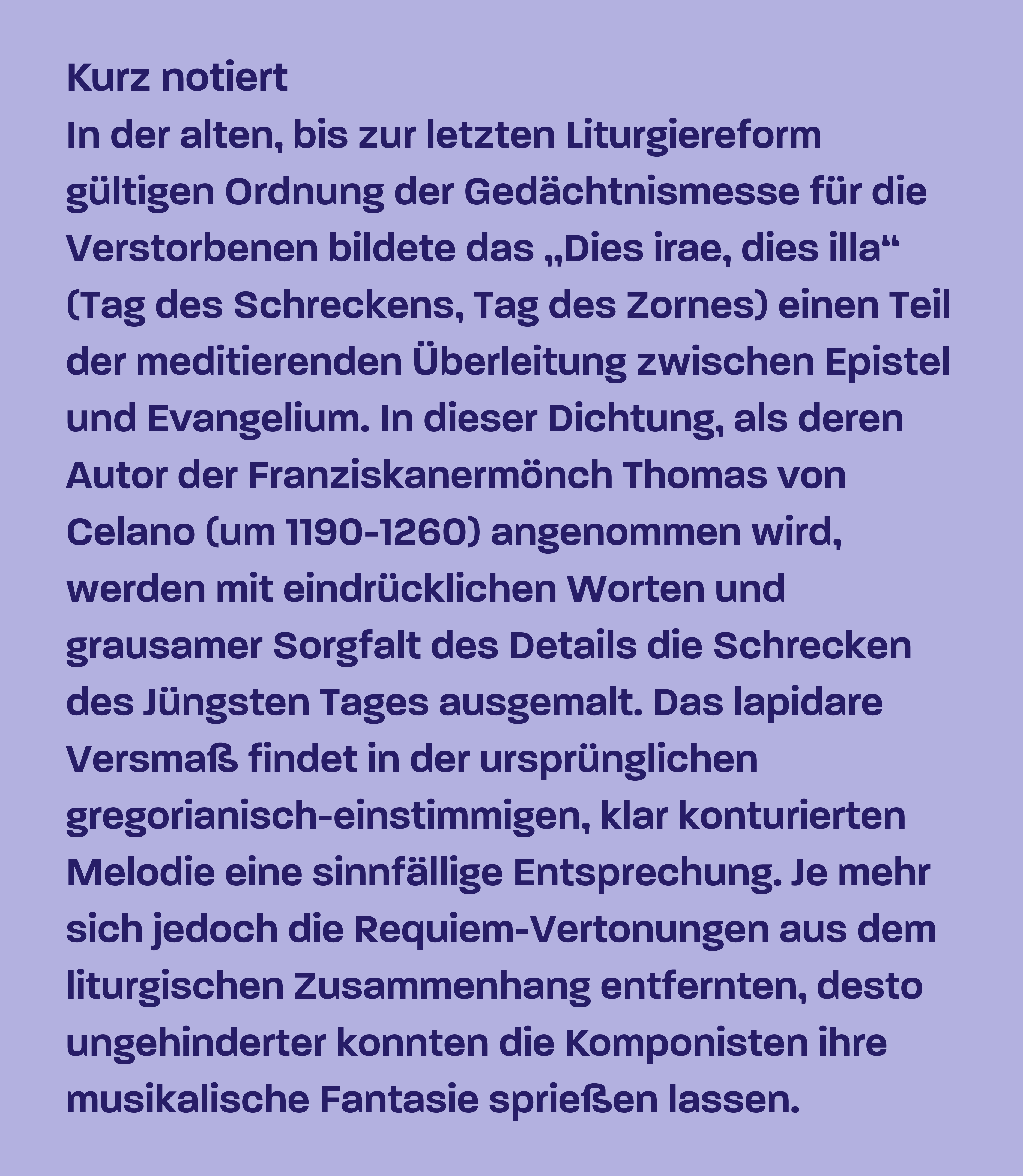 Die Titel der drei Sätze – Lacrymosa, Dies irae, Requiem aeternam – sind Abschnitte aus dem lateinischen Messformular der Missa pro defunctis, der Gedächtnismesse für die Verstorbenen. Sie legen nicht nur eine Satzfolge von langsam – schnell – langsam fest, sondern stimmen auch den Hörer auf den emotionalen Gehalt der Sätze ein und nehmen ihn in eine Gebetssituation hinein, in ein Flehen um Hilfe von außen.