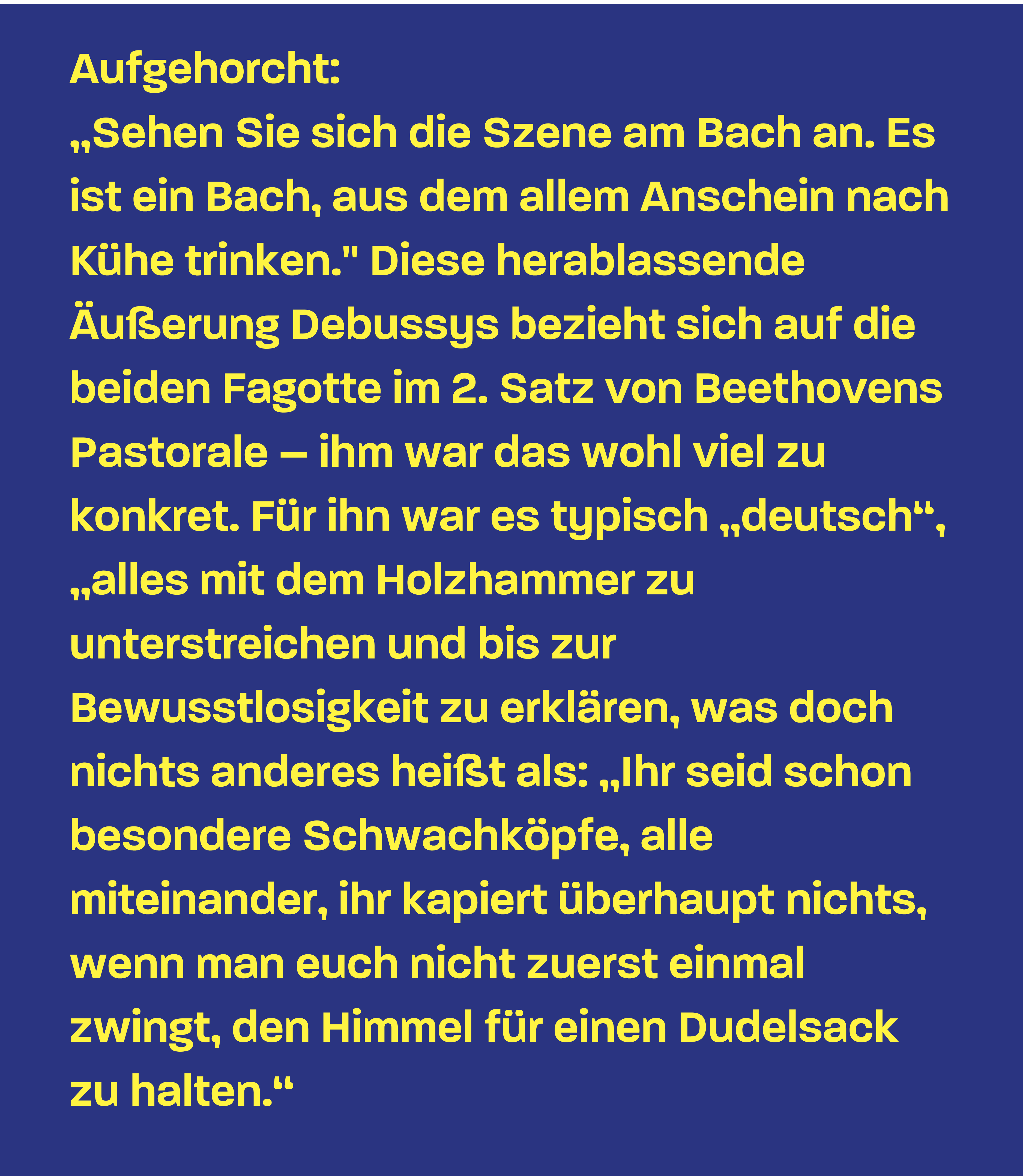 Mit so viel Glückseligkeit, mit den programmatisch anmutenden Überschriften sowie den lautmalerischen Elementen des Stückes (Wasserplätschern und Vogelgezwitscher am Ende des 2. Satzes, holprige Bauerngesänge im 3. Satz, Windesrauschen und Blitzeinschläge im 4.) rief Beethoven – der Titan, der Misanthrop, der Meister der absoluten Musik! – verständlicherweise Misstrauen hervor. Beinah rechtfertigend scheint es, wenn er die Sinfonie mit dem Untertitel „Mehr Ausdruck der Empfindung als Malerei“ versah. Es ging ihm nämlich nicht um eine Eins-zu-Eins-Darstellung des Landlebens, sondern darum, seine eigene, beinah religiöse Auffassung der Natur in Töne zu verwandeln. „Mein unglückseliges Gehör plagt mich hier nicht“, schrieb er wenige Jahre nach der Entstehung der Pastorale auf ein Skizzenblatt. „Ist es doch, als ob jeder Baum zu mir spräche auf dem Lande: heilig, heilig! Im Walde Entzücken! Wer kann alles ausdrücken?“