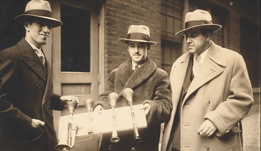 George Gershwin (links) zusammen mit dem Schlagzeuger James Rosenberg (Mitte) und dem Tenor Richard Crooks (rechts) posieren 1929 mit original Pariser Taxihupen, die für eine Aufführung von „Ein Amerikaner in Paris“ verwendet wurden.