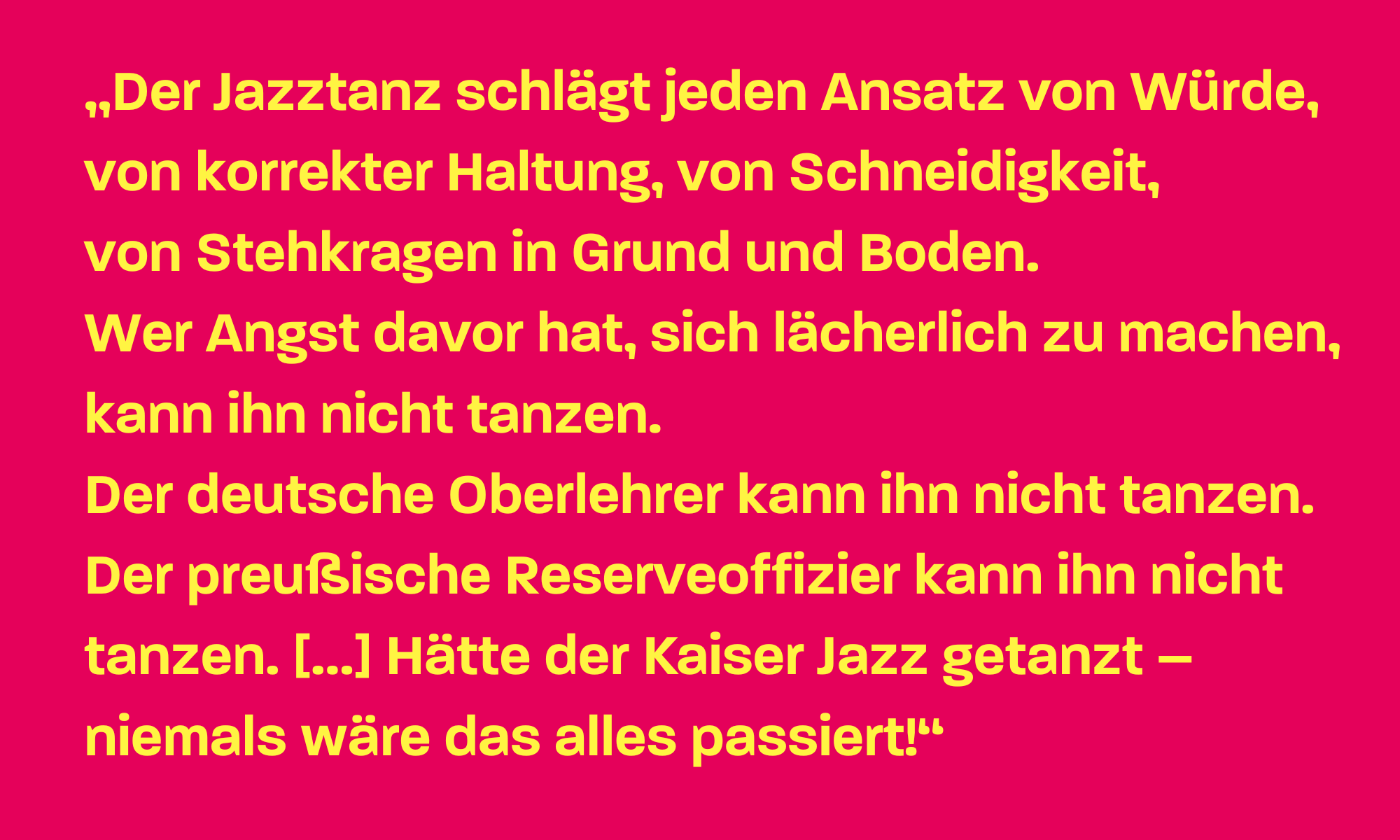 und Fortschrittlichkeit. Der dazugehörige Tanz erfüllte zugleich die Funktion eines symbolischen Abschüttelns von der steifen Gesellschaftsordnung der Wilhelminischen Zeit, wie der Zeitgenosse Hans Siemsen beschreibt: