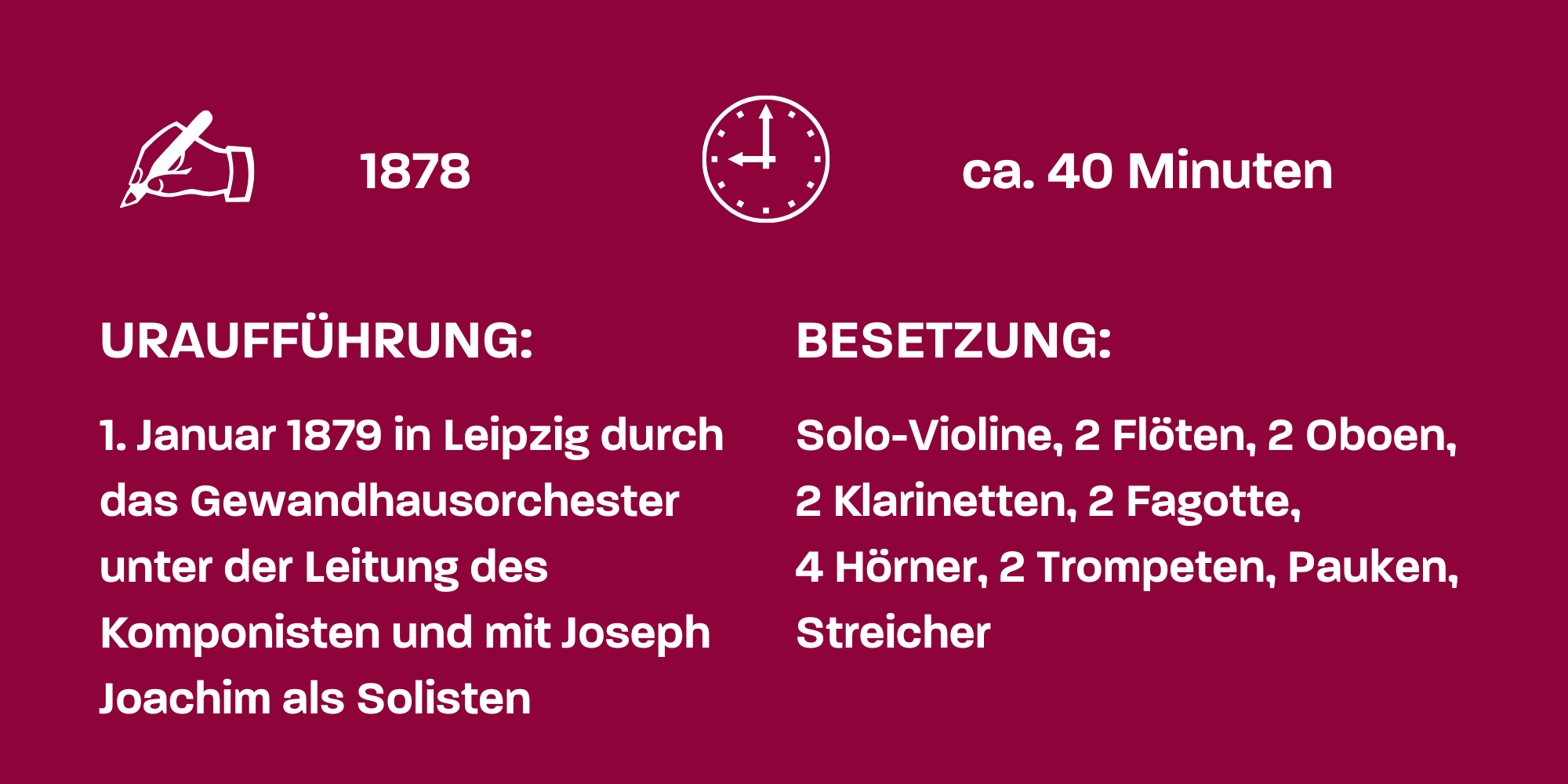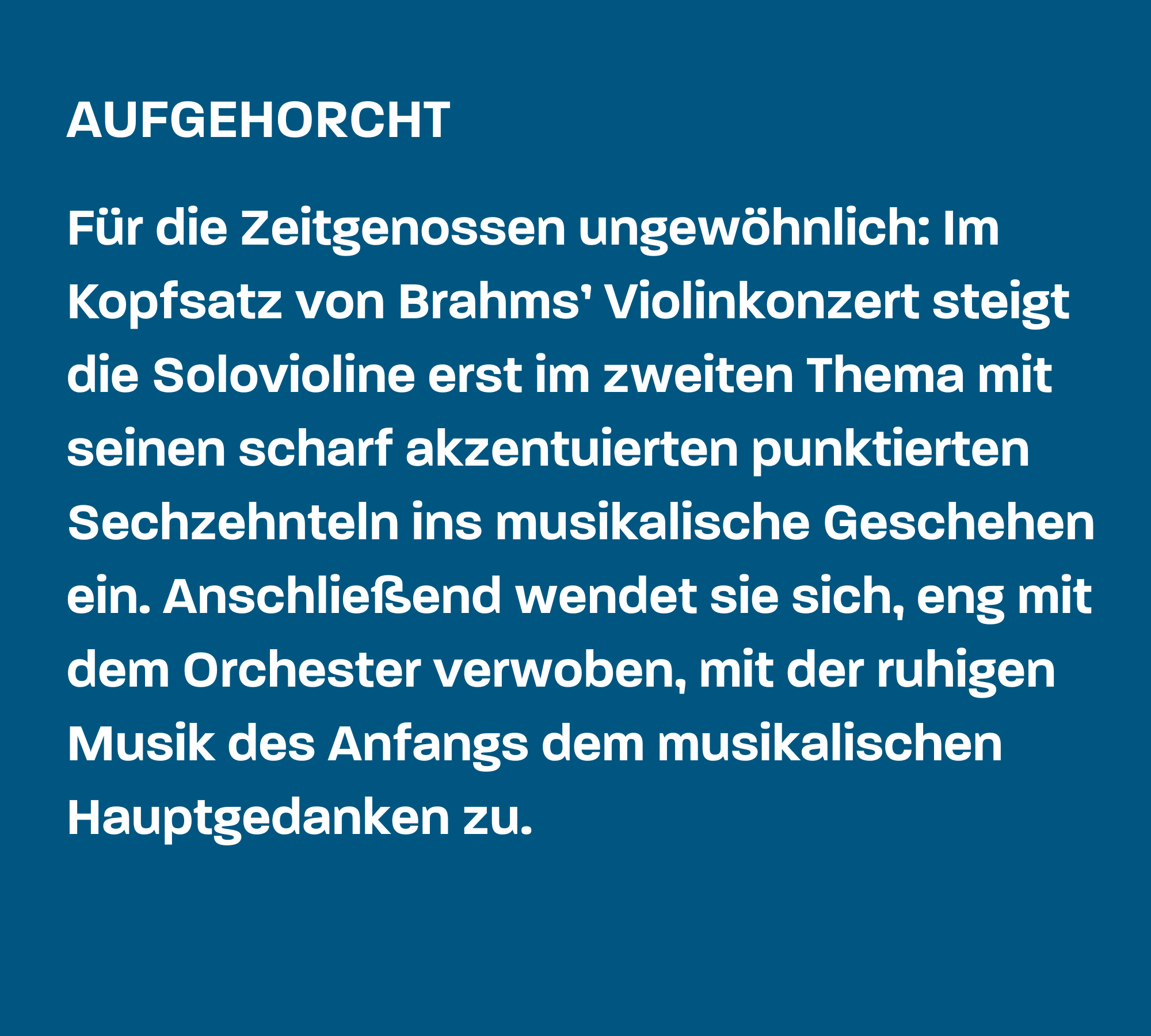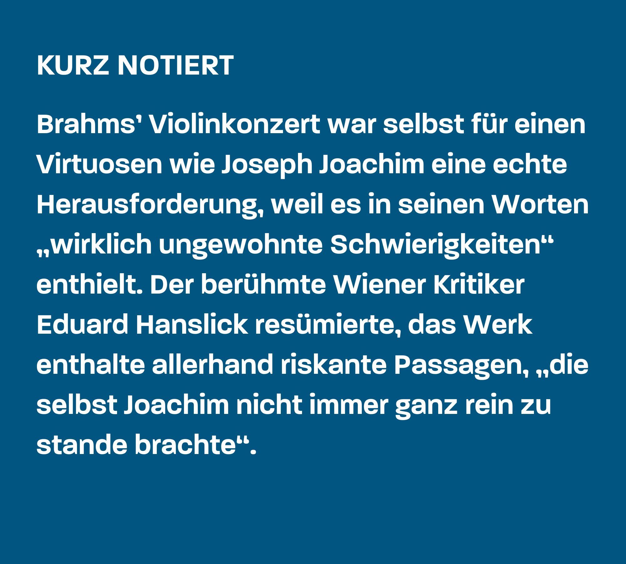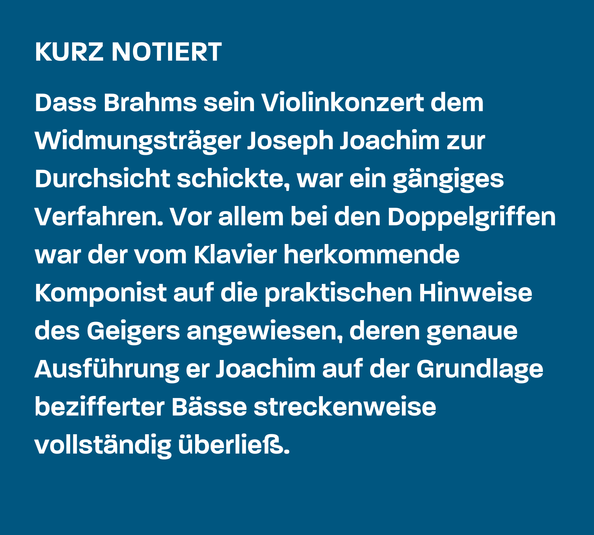 Die vergilbte Schwarz-weiß-Fotografie zeigt einen jungen Mann. Er sitzt im dunklen Anzug mit überkreuzten Beinen in einem breiten Sessel mit schweren Armlehnen, das längere Haar trägt er zurückgekämmt. Neben ihm, den rechten Arm lässig auf die Rückenlehne des Sessels gestützt und die linke Hand in der Hosentasche, steht ein zweiter Mann im dunklen Anzug. Sein Haar hat die gleiche Länge, allerdings ist es gescheitelt und gewellt. Die Aufnahme stammt aus der Zeit um 1855 und zeigt Johannes Brahms und Joseph Joachim. Die enge Freundschaft der beiden nahm zwei Jahre zuvor ihren Anfang, bei einer ersten Begegnung in Hannover. Der rege musikalische Austausch, der zwischen den Musikern stattfand, wirkte vor allem auf Brahms beflügelnd, der zu einem intimen Kenner der Violinliteratur wurde – galt Joachim doch seinerzeit als führende Autorität auf der Geige. Die Zeitgenossen schätzten ihn allerdings auch als Komponisten über alles und stellten sein Konzert d-Moll op. 11 von 1857 „in ungarischer Weise“ auf eine Stufe mit den Violinkonzerten von Beethoven und Mendelssohn Bartholdy.