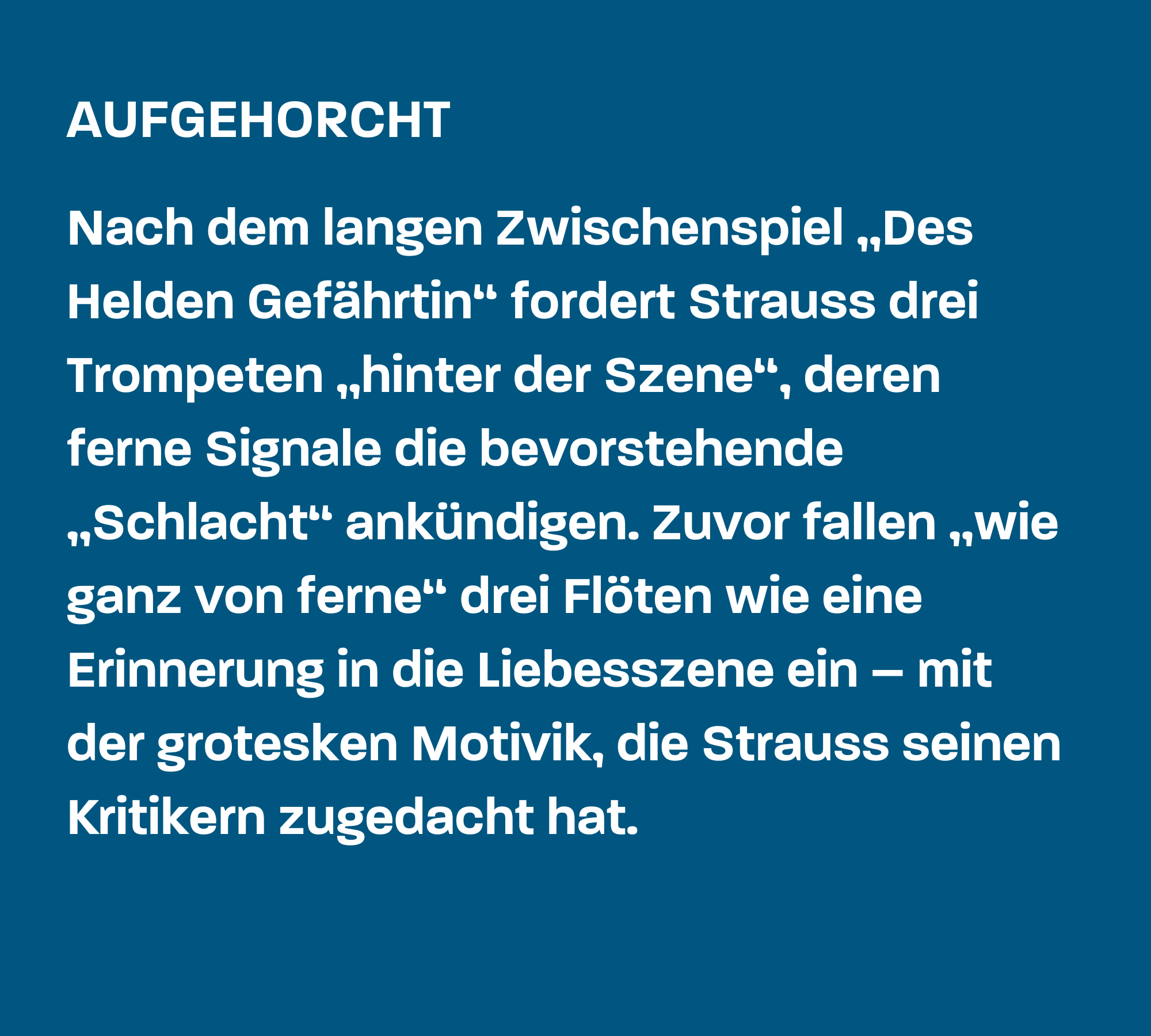 Was die harmonische Kühnheit und den instrumentalen Aufwand betrifft, etwa das Aufgebot an Schlagwerk, sprengt Strauss in diesem Schlachtgemälde jedes bis dahin gekannte Maß: „Er stellt die entferntesten Tonarten mit einer absoluten Kaltblütigkeit übereinander, die sich überhaupt nicht darum kümmert, dass sie ‚verletzend‘ wirken, sondern allein darum, dass sie Leben ausdrücken“ (Claude Debussy). Mit der Reprise – der Titel „Des Helden Friedenswerke“ ist natürlich ironisch gemeint – folgt der Clou des Ganzen, da hier unmissverständlich klar wird, wer sich hinter dem Helden verbirgt. Strauss zitiert nämlich nicht weniger als 30 seiner eigener Werke, und zwar in erster Linie solche, die bei „des Helden Widersachern“, der konservativen Konzertkritik, alles andere als friedvolle Reaktionen ausgelöst hatten: von „Don Juan“ über „Zarathustra“, „Tod und Verklärung“, „Till Eulenspiegel“ bis zu „Don Quixote“ und Strauss’ damals noch einziger Oper „Guntram“.