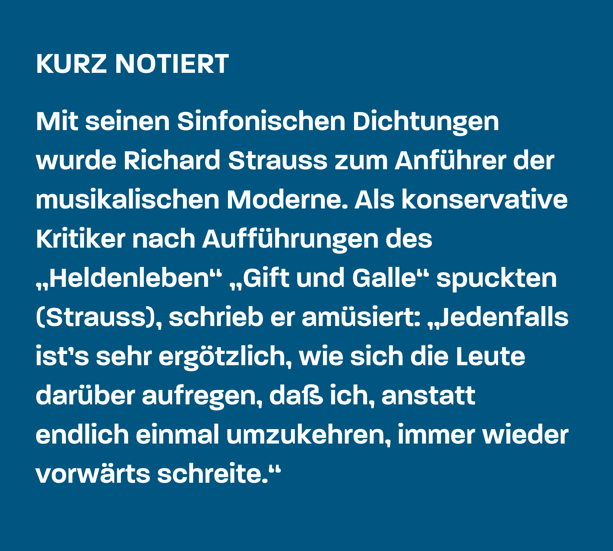 „Ich sehe nicht ein, warum ich keine Sinfonie auf mich selbst machen sollte. Ich finde mich ebenso interessant wie Napoleon und Alexander“. Soweit Richard Strauss, der mit besagter „Sinfonie“ auf dem Höhepunkt seines Ruhms als Preußischer Hofkapellmeister an der Berliner Hofoper eine Art tönende Biographie vorgelegte: „Ein“ bzw. sein „Heldenleben“. Hinsichtlich des „Inhalts“ ließ Strauss verlauten, es reiche „zu wissen, dass es einen Helden im Kampf mit seinen Feinden beschreibt“. Aber gerade damit ließ der Komponist Raum für die doppelte Perspektive des Stücks, das sich nicht nur als Porträt eines Einzelnen hören lässt, sondern als Bild der Wilhelminischen Epoche. Dies mag auch die große Wirkung erklären, die das Stück auf die Zeitgenossen hatte. Sie lässt sich erahnen, wenn man den Bericht des französischen Schriftstellers, Musikhistorikers und Strauss-Bewunderers Romain Rolland liest: „Bei der Erstaufführung in Deutschland habe ich Menschen beim Zuhören zittern, sich plötzlich erheben, unbewusste, heftige Bewegungen machen sehen. Ich selbst habe die eigenartige Trunkenheit, den Taumel dieses wogenden Ozeans gefühlt; und ich habe gedacht, dass zum ersten Mal seit dreißig Jahren die Deutschen den Dichter des Sieges gefunden haben.“