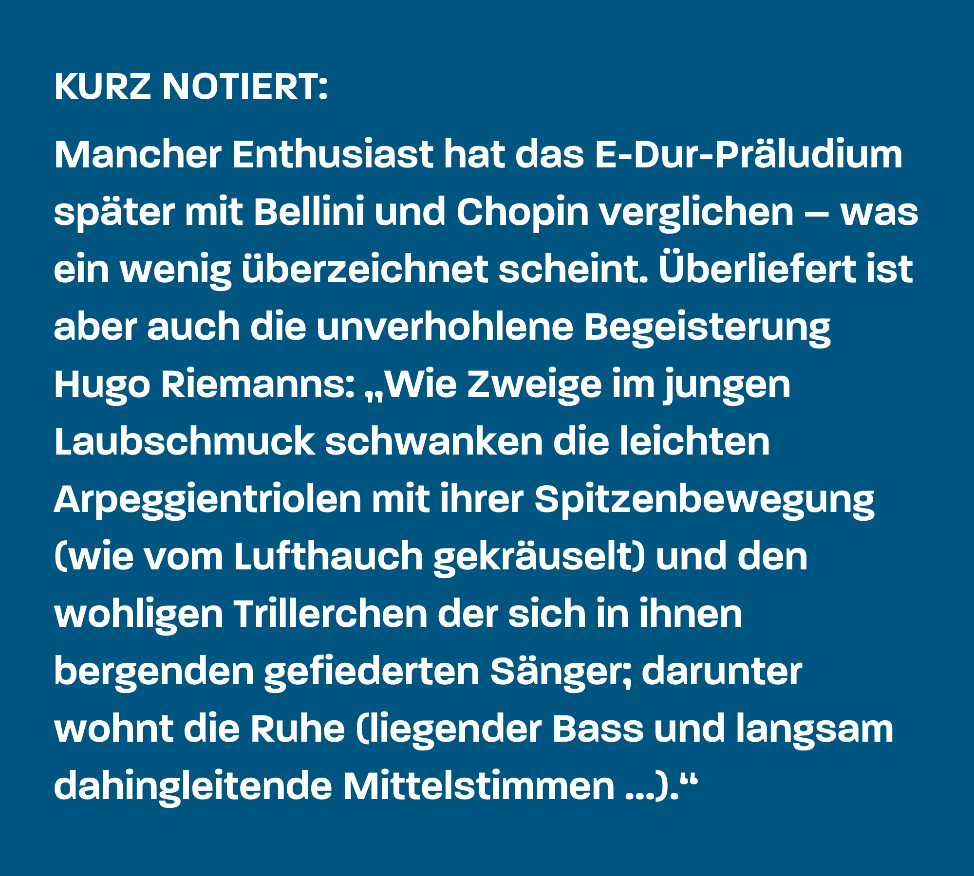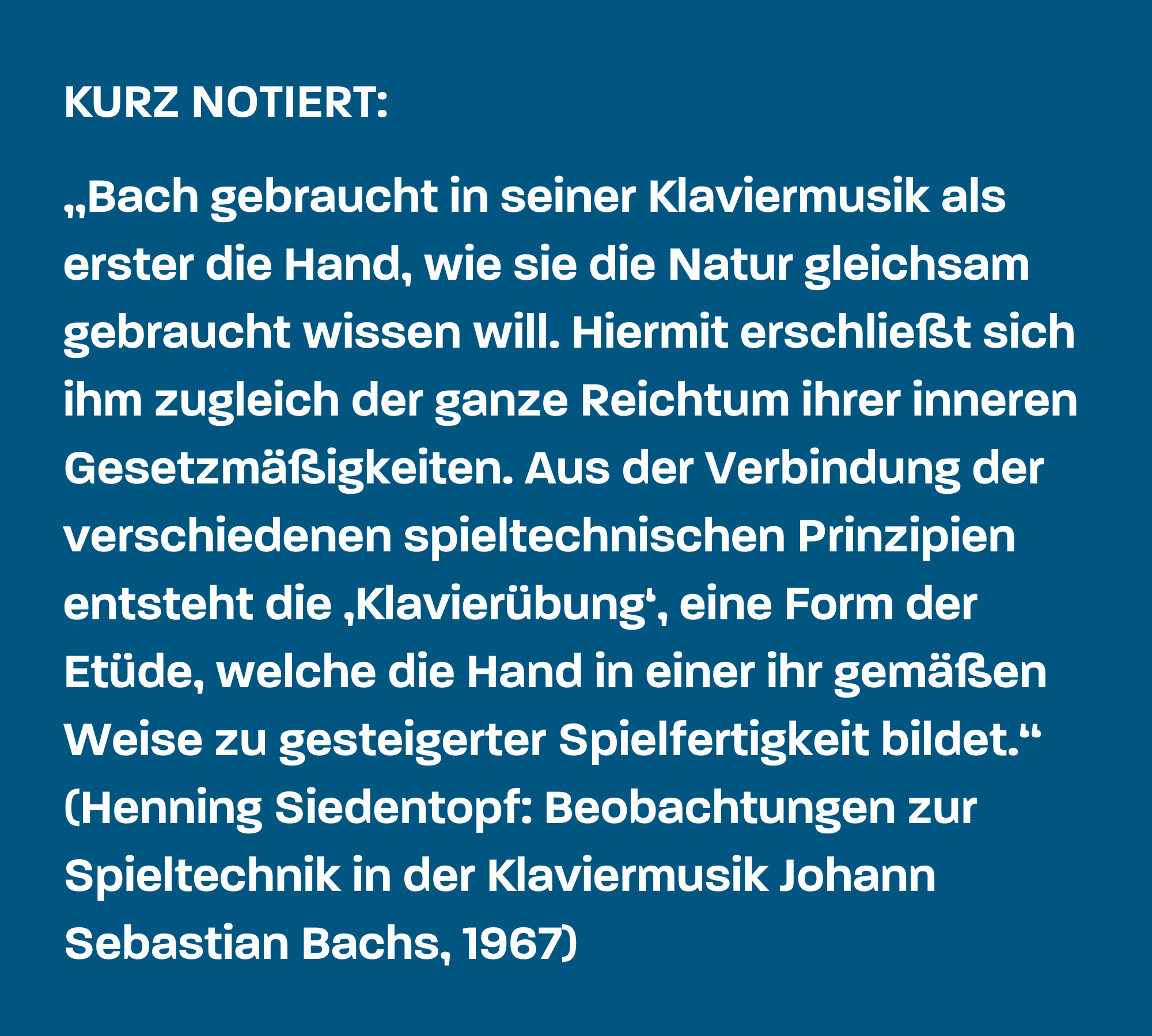 Ob Johann Sebastian Bach diesen Enthusiasmus geteilt hätte, steht dahin. Er war bereits bei Gott, als Schubart seine kühnen Thesen formulierte. Nimmt man jedoch die E-Dur-Werke aus dem um 1722 entstandenen „Wohltemperiertem Klavier“ zum Anlass für einen Abgleich, sind leise Zweifel zumindest angebracht. Bach verstand diesen Repräsentationszyklus, der sich schon im Klavierbüchlein für seinen ältesten Sohn Wilhelm Friedemann findet, in erster Linie als Lehr- und Kunstwerk. Dass er damit zugleich einen wichtigen Beitrag zur Philosophie der Musik leistete, mag der Komponist zumindest geahnt haben. Didaktik und Diskurs gehen eine wunderbare Beziehung miteinander ein: Dem bipolaren Prinzip folgend, sind Präludium und Fuge zu verstehen als jeweils autonome, zyklisch jedoch aufeinander bezogene Stücke.