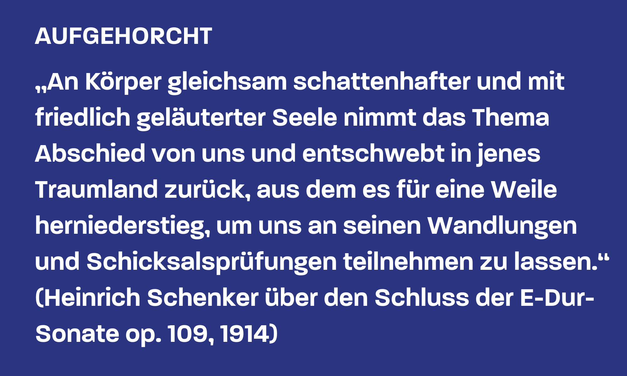 Von hier aus ist der Weg nicht weit zur E-Dur-Sonate op. 109 von 1820, deren Material im Wesentlichen aus einer melodischen Formel besteht. Darin ähnelt dieses Werk dem Opus 90. Nur dass hier aus dem teneramente ein Adagio espressivo geworden ist, während Beethoven das dolce als Spielvorschrift beibehält. Und gewiss dürfte er dabei auch an die Widmungsträgerin gedacht haben. Maximiliane von Brentano war die Tochter seiner Freunde Franz und Antonie Brentano, wobei Letztere wiederum „im Verdacht“ steht, jene (bis heute trotz intensivster Forschungen noch nicht zweifelsfrei ermittelte) „unsterbliche Geliebte“ gewesen zu sein. Hört man allein das sehnsüchtige Finale, das laut seinem Schöpfer „mit innigster Empfindung“ „gesungen“ werden soll, erhält man zumindest eine Ahnung von den tiefen Gefühlen eines Mannes, der noch zuvor, in der „Hammerklaviersonate“, die Welt buchstäblich aus den Fugen gekippt hatte. Nun scheint er beruhigt; nur für Momente, im harschen e-Moll-Prestissimo, blitzt heiliger Zorn auf, nicht aber anarchistisch wie sonst bei Beethoven, sondern eher leidenschaftlich für die Sache eintretend. Ansonsten schimmert meist mildes Licht über der Szene und dominiert unumschränkt ein sanfter Melos. Und das insbesondere im Andante, molto cantabile ed espressivo, dessen mezza-voce-Thema sich schon im Kopfsatz angekündigt hatte, nun aber durch alle Variationen hindurch seine sanften Bahnen zieht, um schließlich zu seiner ursprünglichen Gestalt zurückzukehren.