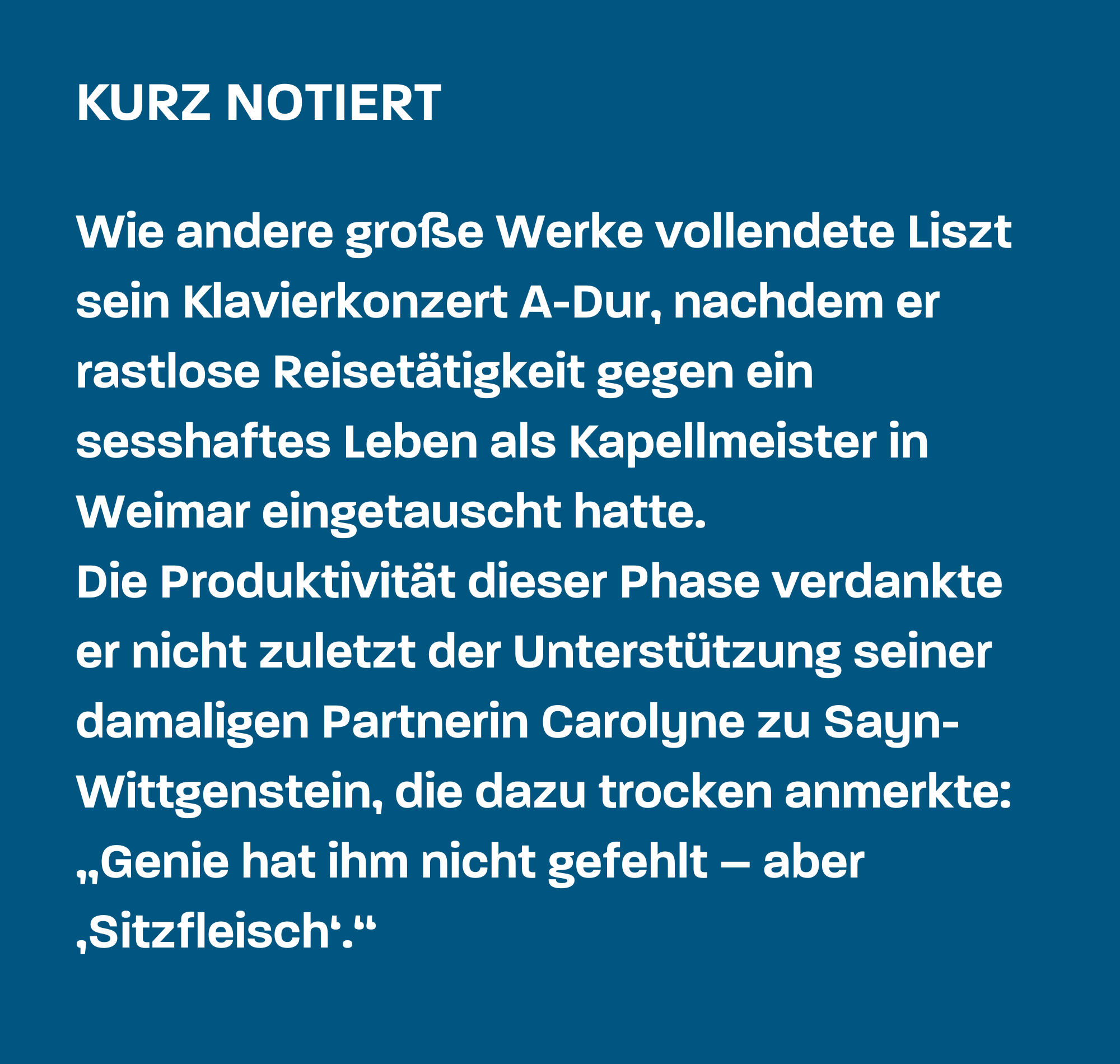 Virtuosität ist eine schwierige Sache und das nicht nur, wenn man sie hervorbringen soll. Denn obwohl wir uns oft von den Leistungen brillanter Instrumentalisten begeistert zeigen, laufen solche sportiven Einlagen immer auch Gefahr, uns von den inneren Qualitäten einer Darbietung oder eines Werks abzulenken. Wir haben, gebannt von technischen Höchstleistungen, vielleicht gar keinen Impuls mehr, einen Blick hinter die glitzernde Fassade zu werfen, was im Falle von Franz Liszts Klavierkonzert in A-Dur allerdings eine ziemliche Verschwendung wäre.