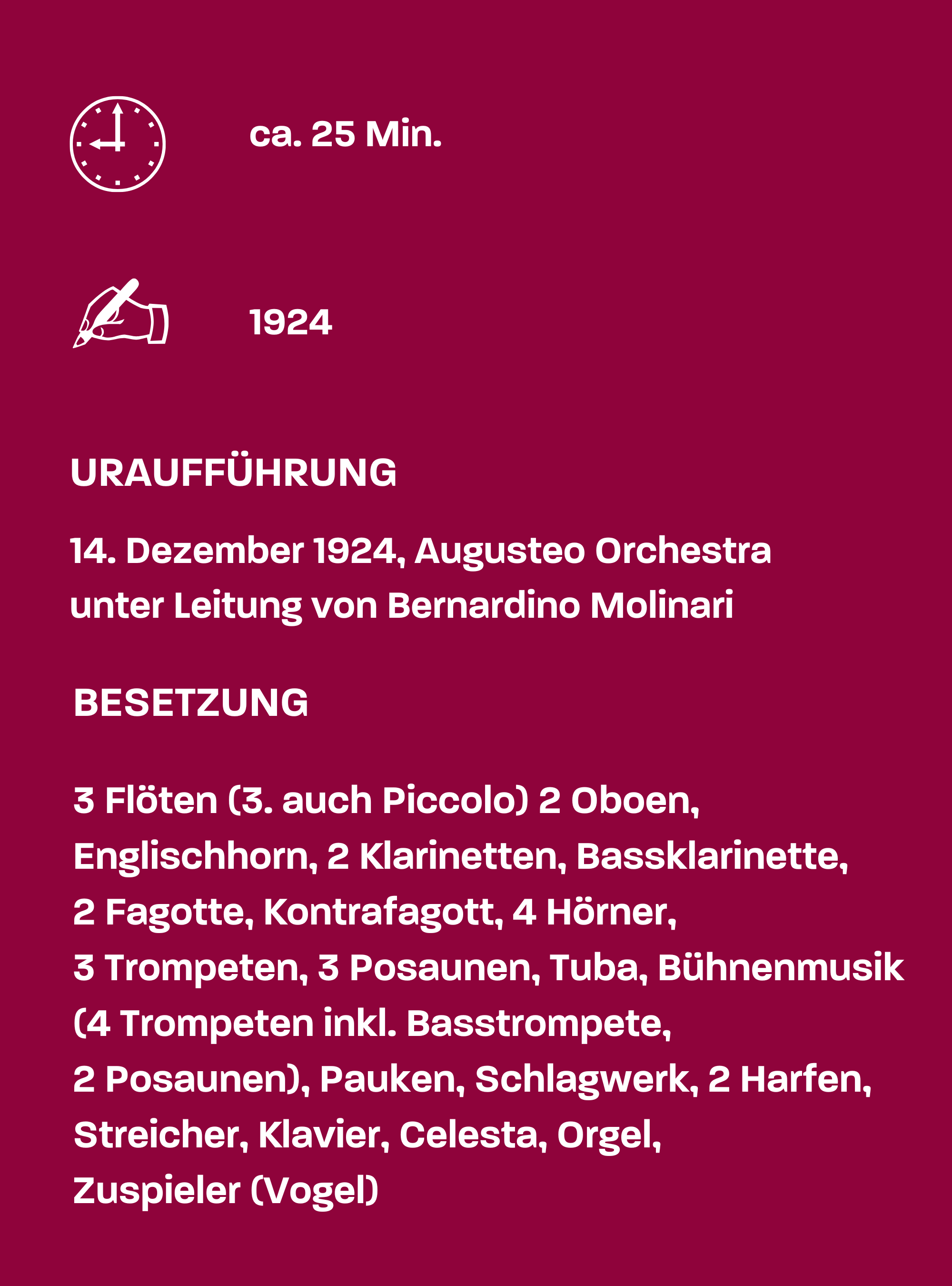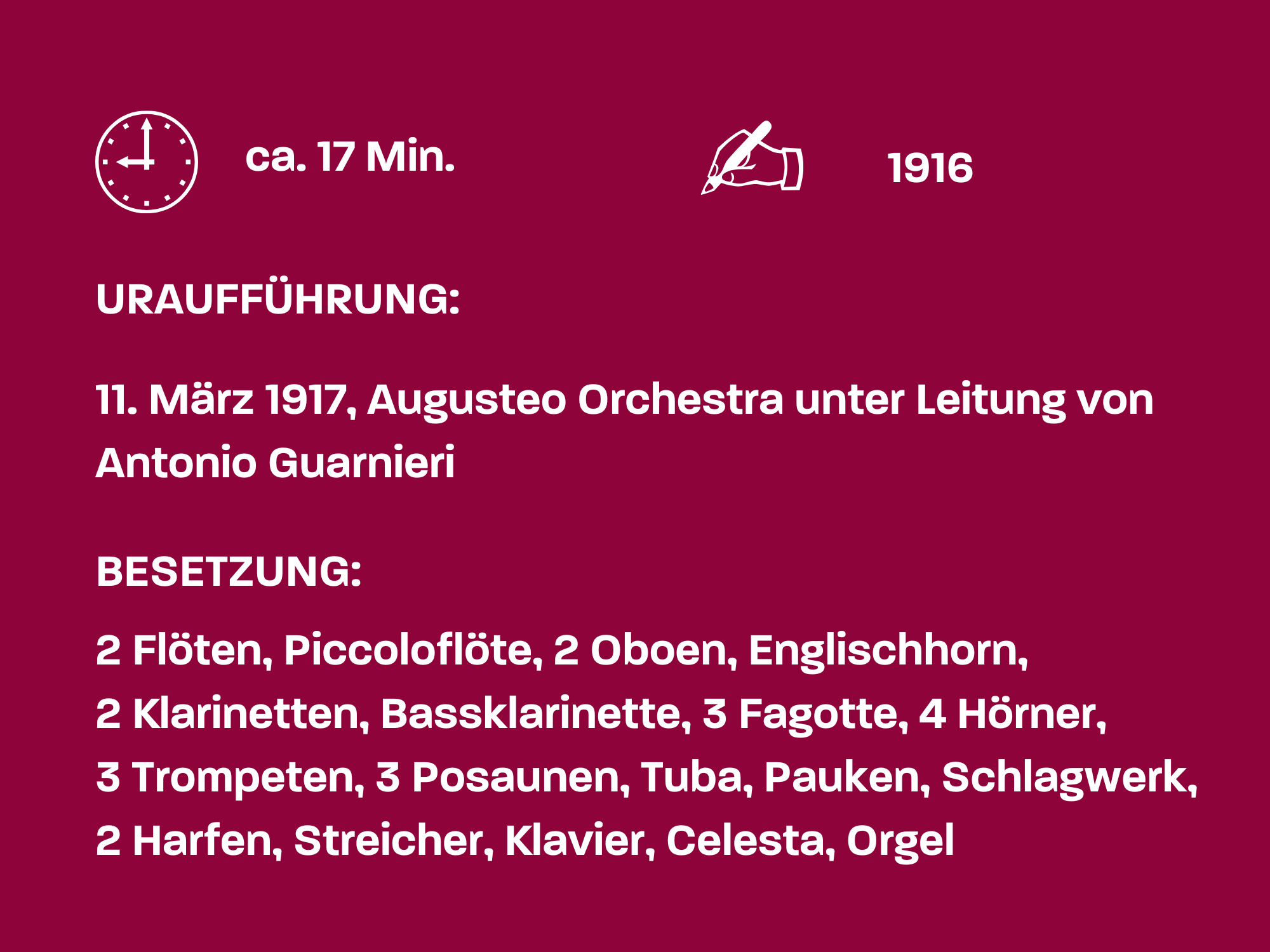 Geboren und aufgewachsen in Bologna, hatte Respighi dort ebenfalls seine musikalische Ausbildung erhalten. 1899 erwarb er am dortigen Konservatorium Abschlüsse als Geiger und Komponist, bevor er für zwei Spielzeiten von einer italienischen Opernkompanie in St. Petersburg engagiert wurde. Diese Aufenthalte ermöglichten es ihm, als Schüler von Nikolai Rimsky-Korsakow Einblicke in dessen legendäre Kunst der Instrumentation zu erhalten, mit der sich dem komplexen Organismus eines großen romantischen Orchesters Klanggemälde von überwältigender Wirkung entlocken lassen. Dieser Impuls sollte in jenen Tondichtungen besonders reife Früchte tragen, mit denen Respighi seiner neuen Heimat Rom ein überlebensgroßes Denkmal setzte und gleichzeitig den Grundstein seines eigenen Ruhms legte.