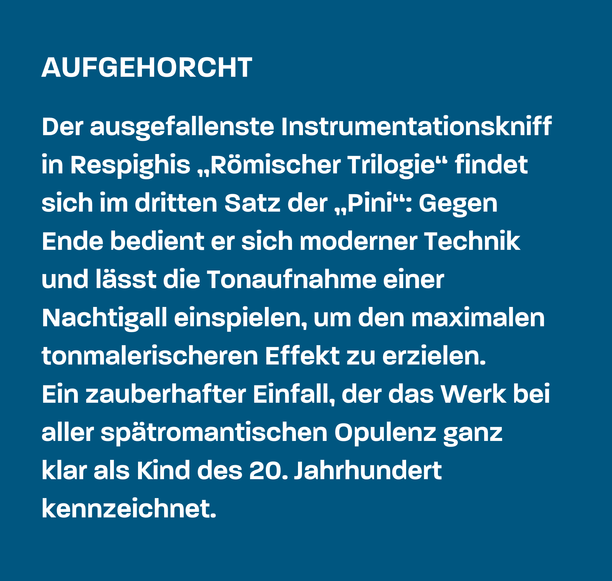 Genau zu dieser Zeit des um sich greifenden Totalitarismus komponiert Respighi an seinen „Pini“ und beschließt das Werk ebenfalls mit einer machtvollen Geste militaristischer Anmutung – aber der Reihe nach. Wie sein Vorgänger besteht das Stück aus vier Sätzen, die noch mehr als zuvor den Charakter von lebendigen Szenen haben und dieses Mal vom hellen Tageslicht durch die Nacht führen, um in der Morgendämmerung zu enden. Im lärmenden ersten Satz verarbeitet Respighi Fetzen italienischer Kinderlieder, porträtiert deren ausgelassenes Spiel im Garten der Villa Borghese. Das steigert sich zu einem schwindelerregenden Wirbel und bricht dann jäh ab, um einer völlig gegensätzlichen Atmosphäre Platz zu machen. Die Musik zeichnet nun den Eingang einer Gruft, aus der uns eine Ahnung mittelalterlicher Gesänge anweht, die sich zu einem mächtigen Hymnus steigern und anschließend wieder versinken. Danach lässt Respighi Wolken von süßem Sommernachtsduft aus dem Halbrund des Orchesters aufsteigen und entfaltet mit allem ihm zur Verfügung stehenden Raffinement ein mitternächtliches Porträt des Gianicolo, einem der zahlreichen Hügel im Stadtgebiet Roms.