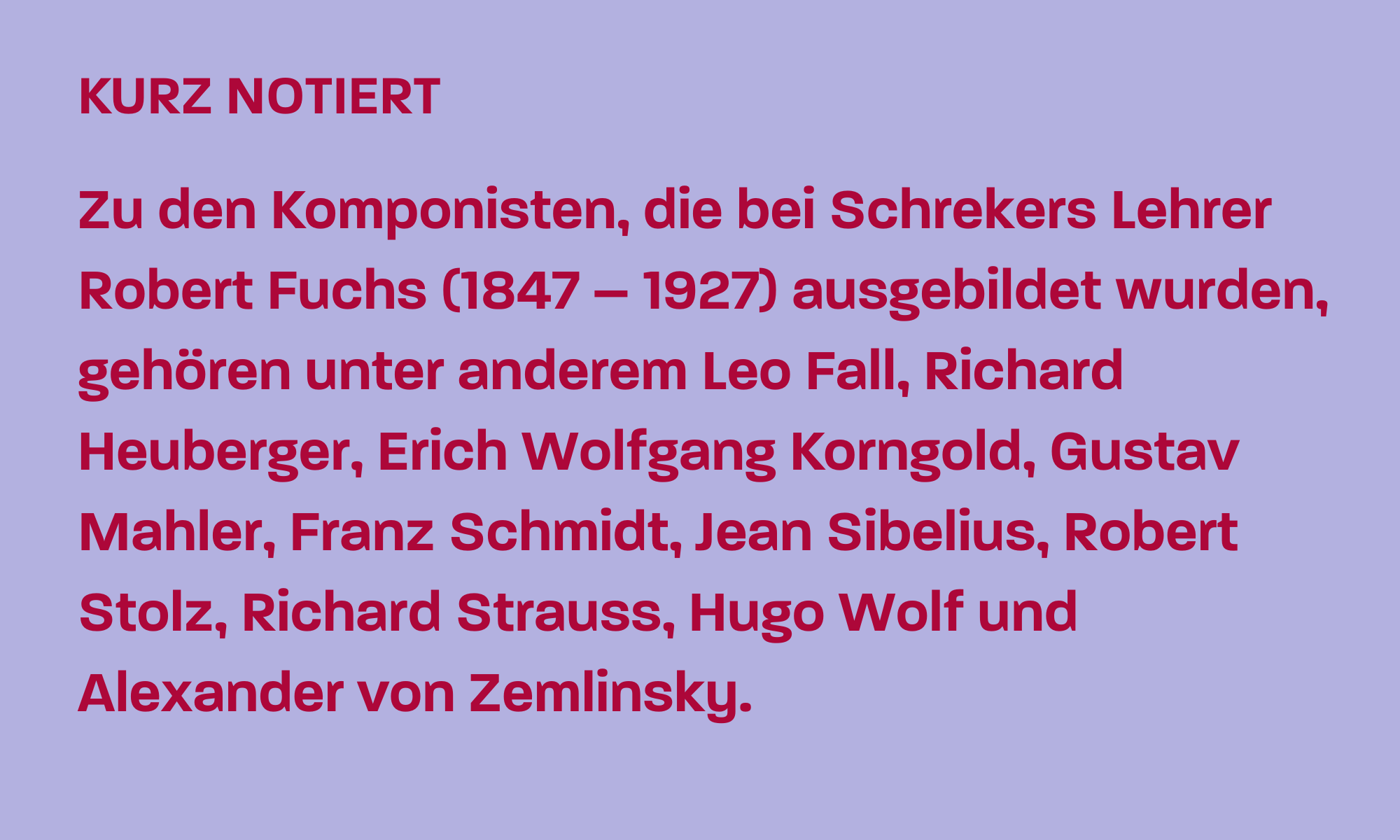Franz Schreker gehörte nicht zu den Komponisten – wie etwa Gustav Mahler –, deren musikalische Handschrift schon mit den ersten Kompositionen erkennbar war. Er hatte dank eines Stipendiums seit 1892 am Wiener Konservatorium studiert: zunächst Violine, dann – ab 1897 – auch Komposition. Sein Lehrer war Robert Fuchs, aus dessen Klasse eine Vielzahl von später berühmten Komponisten hervorging.