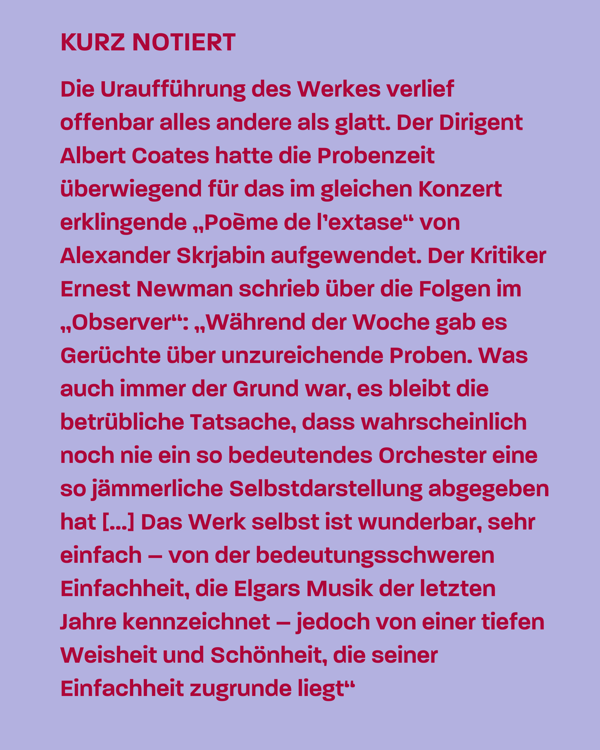 „Alles Gute und Erfreuliche und Reine und Frische und Liebliche ist weit weg – und wird nie mehr wiederkehren“, klagte Edward Elgar im September 1917 und beschrieb damit eine ihn immer mehr erfüllende Stimmungslage. Für ihn, ohnehin ein Melancholiker, wurden nun Nostalgie, Trauer, Verzweiflung zum beherrschenden Lebensgefühl. Freunde und Weggefährten starben in dieser Zeit, vor allem aber erfuhr Elgar den Krieg, trotz seines für England siegreichen Ausgangs, als Ende eines Zeitalters, mit dem er sich identifizierte.