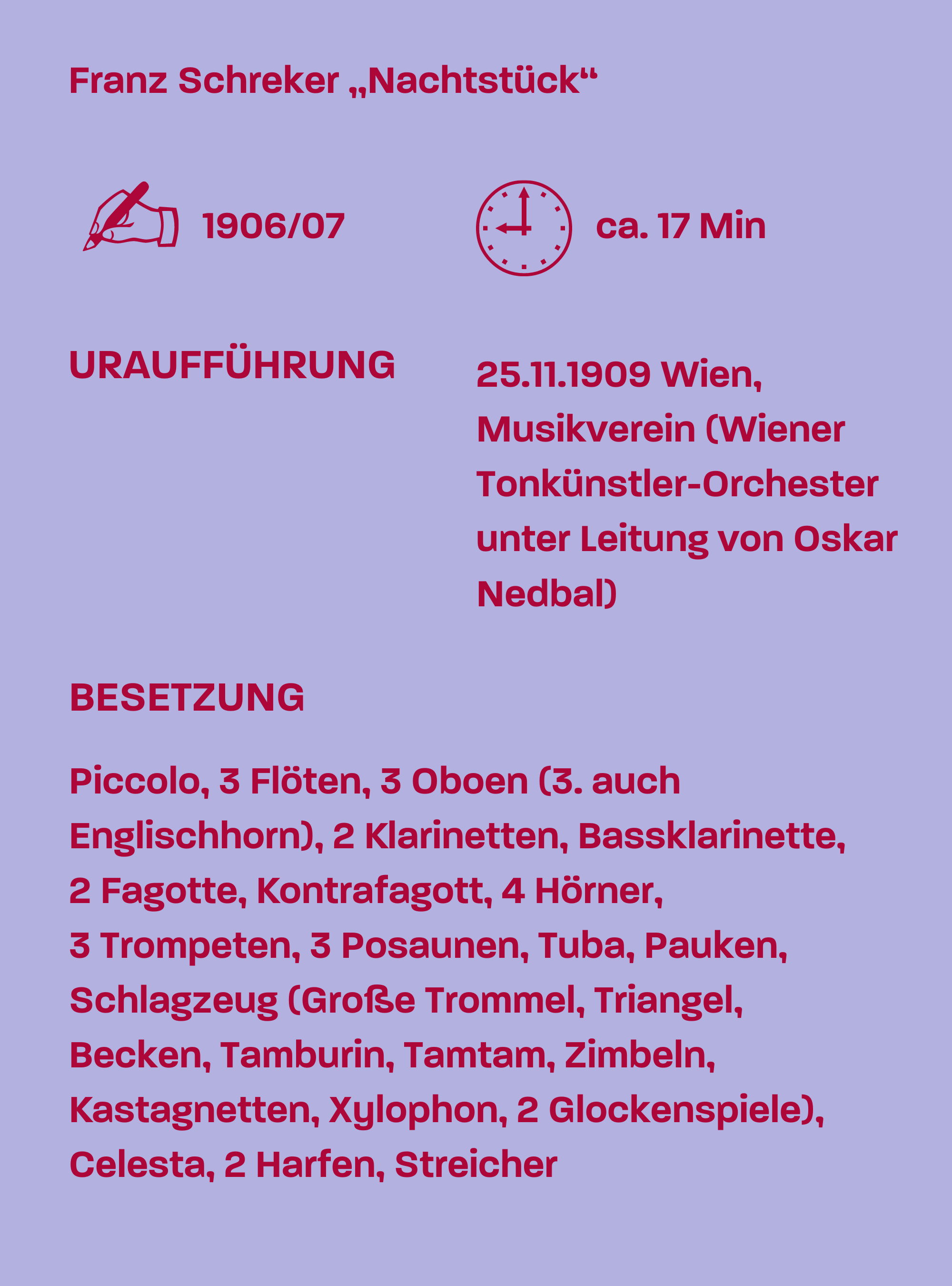Die sensationell erfolgreiche Uraufführung der Oper „Der ferne Klang“ am 18. August 1912 in Frankfurt am Main brachte für Franz Schreker den Durchbruch zu internationaler Anerkennung. Das von Schreker selbst verfasste Libretto erzählt die tragisch endende Geschichte eines Komponisten, der seine Geliebte verlässt, um in der Fremde dem „fernen Klang“ nachzujagen, den er innerlich erahnt, aber nicht zu fassen vermag. Schreker hatte wahrscheinlich schon 1902 mit der Arbeit an der Oper begonnen, konnte das Werk aber zunächst nicht fertigstellen. 1905 brach er die Arbeit mitten im 2. Akt ab. Er befand sich damals in einer schwierigen Phase seines Lebens. Seine materielle Situation war prekär. Im Wiener Adressbuch ist er zwischen 1905 und 1907 als Kontorist geführt, musste sich seinen Lebensunterhalt also offenbar als Bürokraft verdienen. Die Arbeit am „Fernen Klang“ nahm er Ende 1906 wieder auf, aber nicht an jener Stelle im 2. Akt, wo er die Arbeit zuvor unterbrochen hatte, sondern Schreker skizzierte zunächst ein Orchesterzwischenspiel, das zwei Szenen des 3. Aktes verbinden sollte – eben das „Nachtstück“ –, das er Ende Januar 1907 fertigstellte. Er war sich dessen bewusst, dass ihm da etwas Außergewöhnliches gelungen war: „Noch nie habe ich etwas ähnliches auch nur geschaffen. Du würdest staunen – das ist etwas ganz anderes, als ich bis jetzt zuwege brachte – groß – eine Steigerung wie ich sie selten noch hörte. [...] Fabelhaft schwierig, aber wirklich wunderbar ist das Stück geworden. Zauberhaft sag ich Dir“, schrieb er an die befreundete Grete Jonasz.