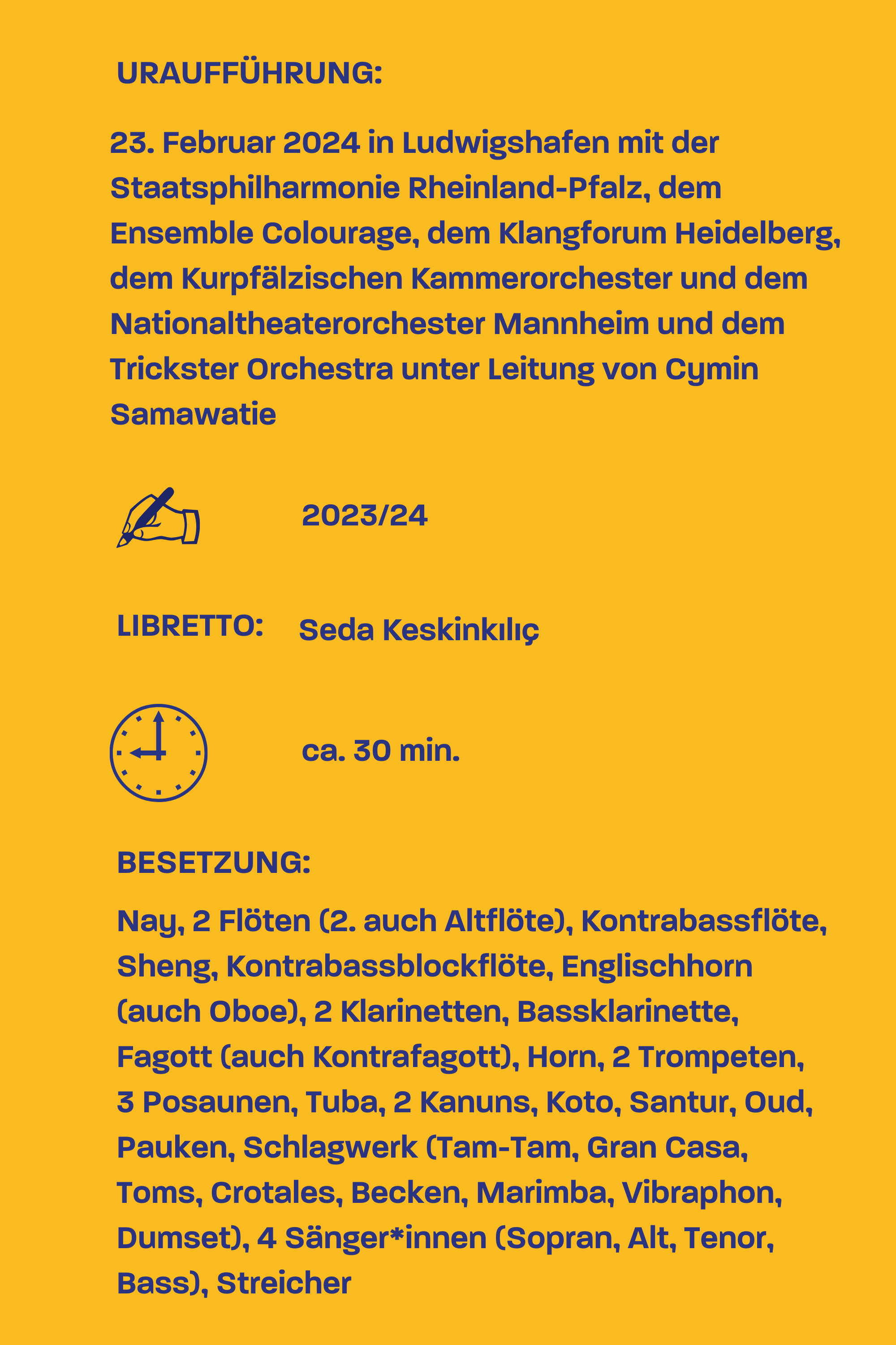 Für das Libretto hat die Mannheimer Künstlerin und Autorin Seda Keskinkılıç sich in persönlichen Gesprächen und Begegnungen mit ganz unterschiedlichen Menschen in der Rhein-Neckar-Region ausgetauscht, ihnen zugehört. Ihr Text macht die vielschichtigen und vielsprachigen Geschichten von Migration und Postmigration, von Anschluss und Ausschluss hörbar und fragt nach neuen Ansätzen, über die wir uns selbst in unserer Ähnlichkeit mit anderen verstehen können.