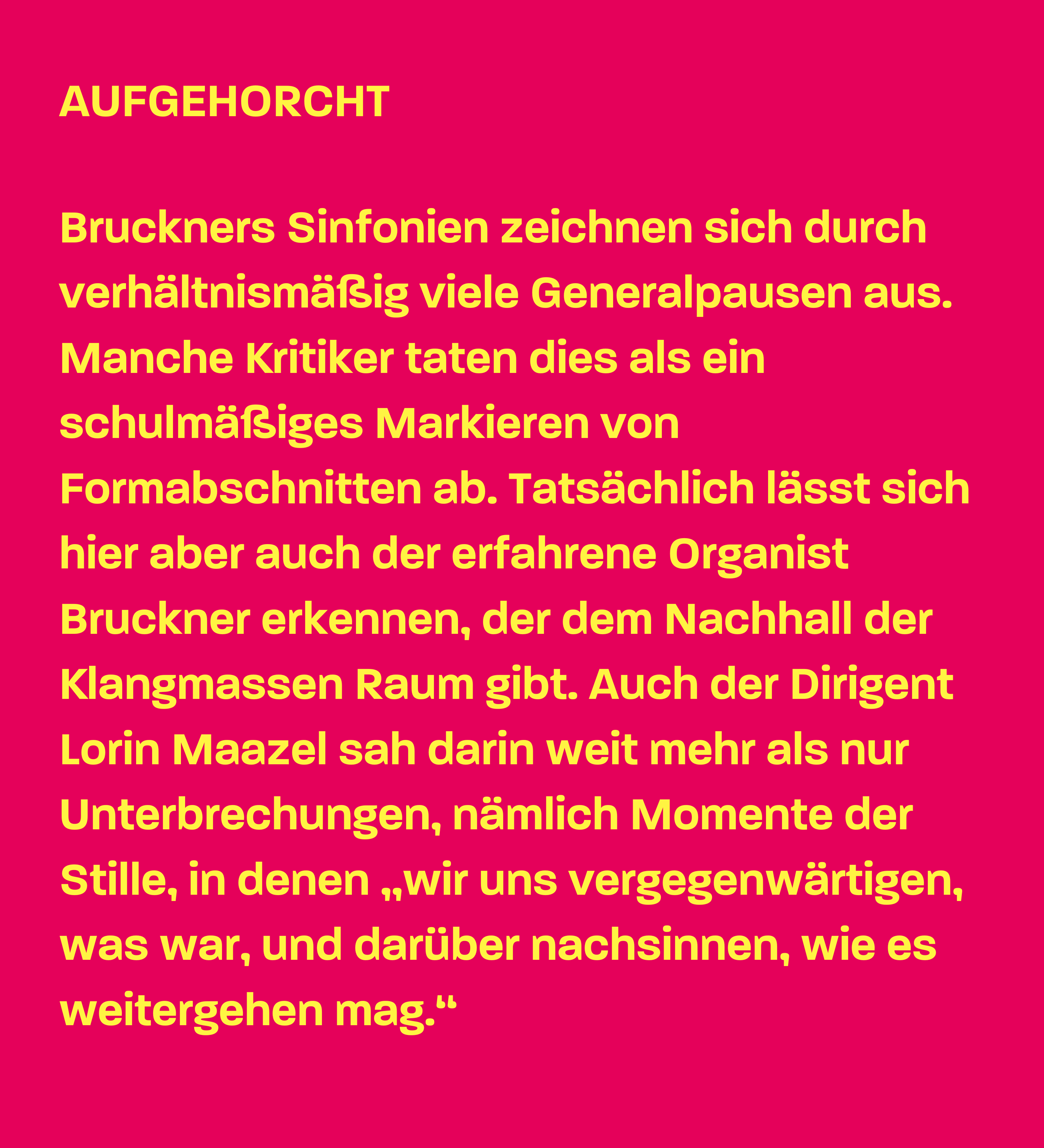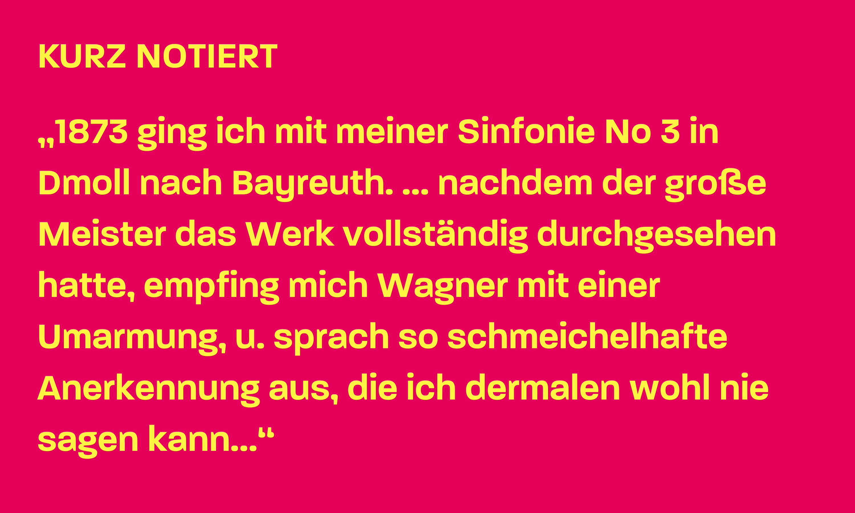 Bei Anton Bruckner reichte bereits eine einzelne Sinfonie aus, dass sich bei manchen Zuhörerinnen und Zuhörern der Eindruck von zu viel des Guten einstellte. Vor allem die Uraufführung der 3. Sinfonie – mit 75 Minuten die längste Sinfonie, die bis dato geschrieben worden war – gestaltete sich als totales Debakel. Der berüchtigte Kritiker Eduard Hanslick formulierte es vorsichtig: „Wir möchten dem als Menschen und Künstler von uns aufrichtig geehrten Komponisten, der es mit der Kunst ehrlich meint, so seltsam er mit ihr umgeht, nicht gerne wehtun, darum setzen wir an die Stelle einer Kritik lieber das bescheidene Geständnis, daß wir seine gigantische Symphonie nicht verstanden haben.“