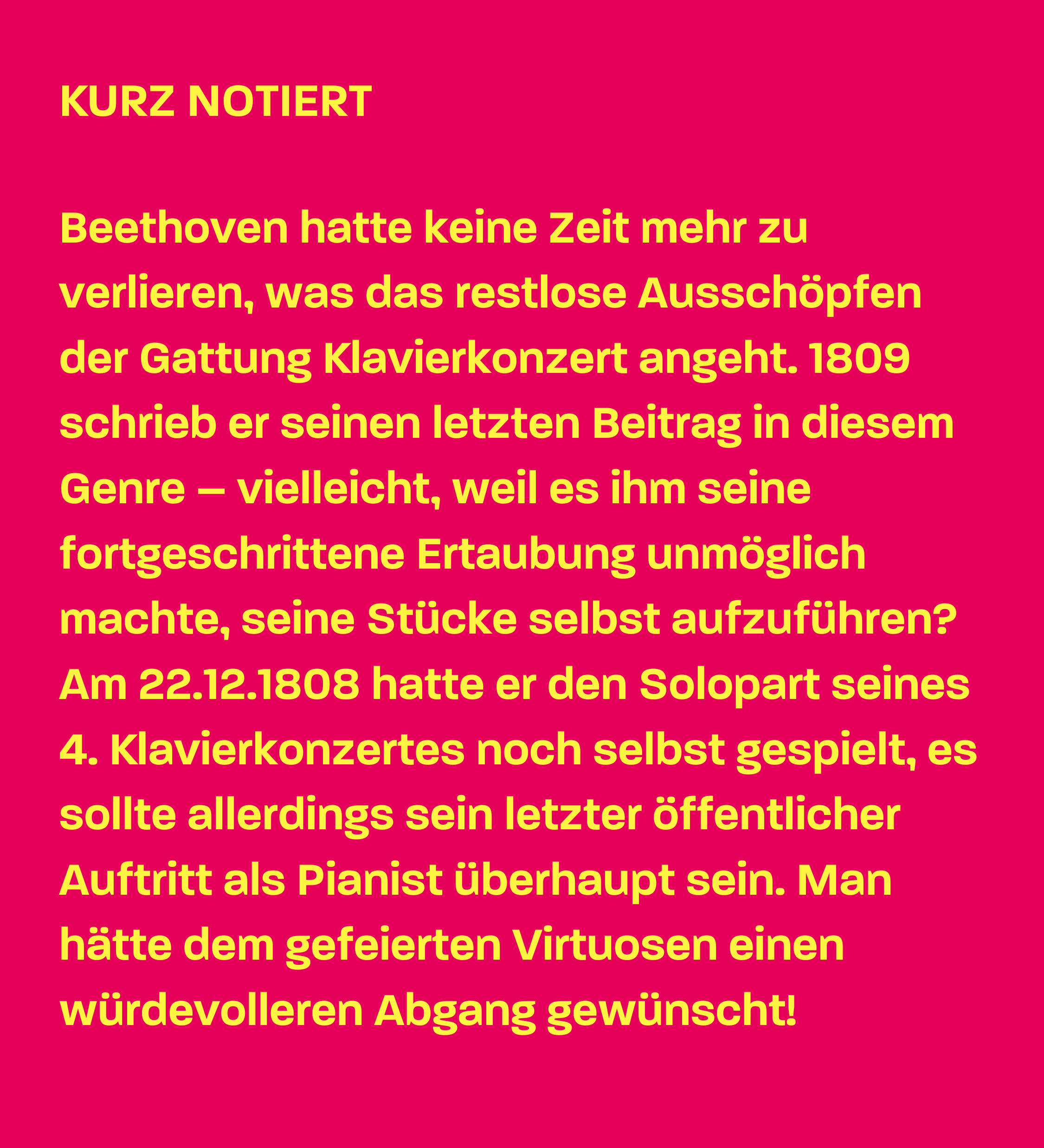 Vielleicht war und ist die Hörerschaft aber auch einfach überfordert mit der Andersartigkeit und ungewöhnlichen Sanftheit dieses Klavierkonzertes und sucht daher verzweifelt nach Erklärungen. Andererseits galt Beethoven ja seit jeher als das absolute Gegenteil von sogenannter Programmmusik, die sich auf außermusikalische Gegenstände wie zum Beispiel die antike Mythologie bezieht. Und eigentlich sollten Extreme bei Beethoven auch nicht weiter überraschen: Sein 1803 entstandenes 3. Klavierkonzert etwa beginnt mit einer dramatischen Orchestereinleitung in c-Moll – der bis dato längsten der Musikgeschichte. Da liegt es doch fast nahe, jetzt das andere Extrem auszukosten und – wiederum zum ersten Mal in der Musikgeschichte – gänzlich auf ein Orchestervorspiel zu verzichten.