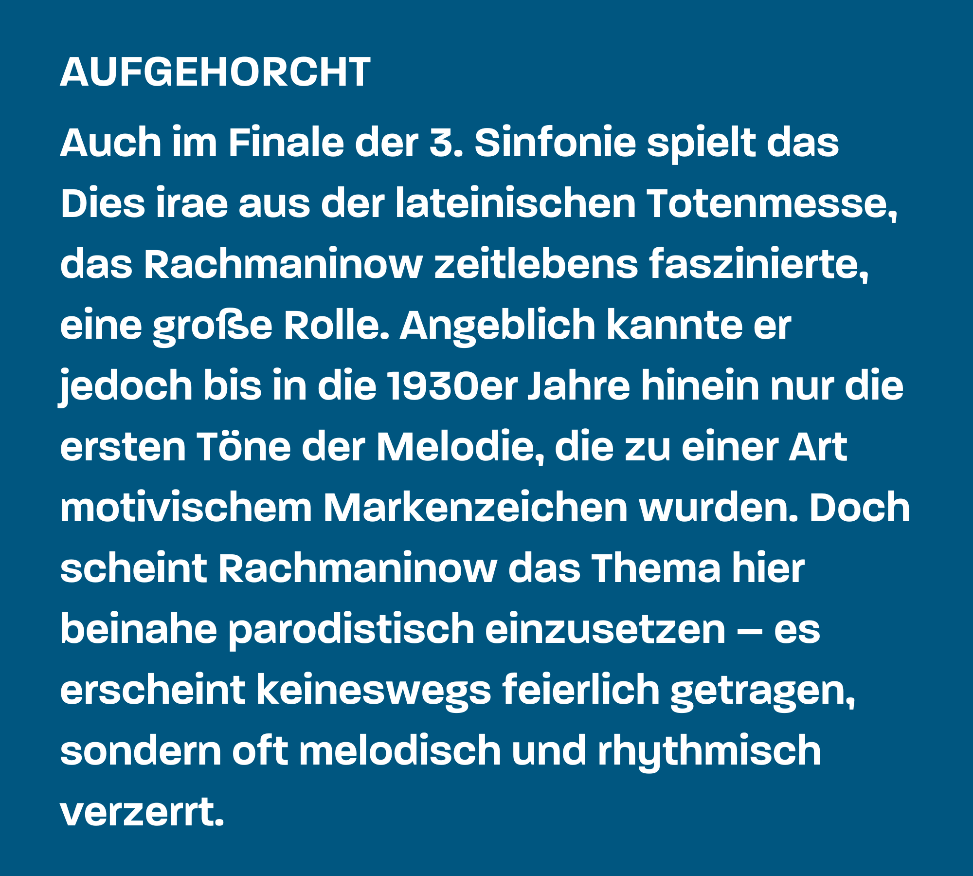 Als Sergej Rachmaninow im Jahr 1917 Russland verließ und ins Exil ging, aus dem er nie zurückkehren sollte, hatte er bereits ein Werk von beachtlichem Umfang vorgelegt: Von seinen insgesamt 45 Werken mit Opuszahl waren 39 bis zu diesem Zeitpunkt entstanden. Was folgte, war eine lange Phase, in der er, zunächst gezwungenermaßen, ein enormes Pensum an Konzerten als Pianist absolvierte und nahezu nicht mehr komponierte. Umso bemerkenswerter ist es, dass Rachmaninow in seinen letzten Lebensjahren noch einmal eine Reihe von großformatigen Werken schrieb, die stilistisch zwar an die Charakteristika anschließen, die seine Bekanntheit als Komponist begründet hatten – darunter nicht zuletzt jene unverwechselbare Melodik, die so großen Einfluss auf den typischen Klang der Hollywood-Filmmusik hatte – aber zugleich noch einmal neue Aspekte eröffnen. Die Dritte Sinfonie, entstanden in seiner Sommerresidenz Villa Senar in Luzern, ist vielleicht das eigenwilligste und rätselhafteste dieser Spätwerke.