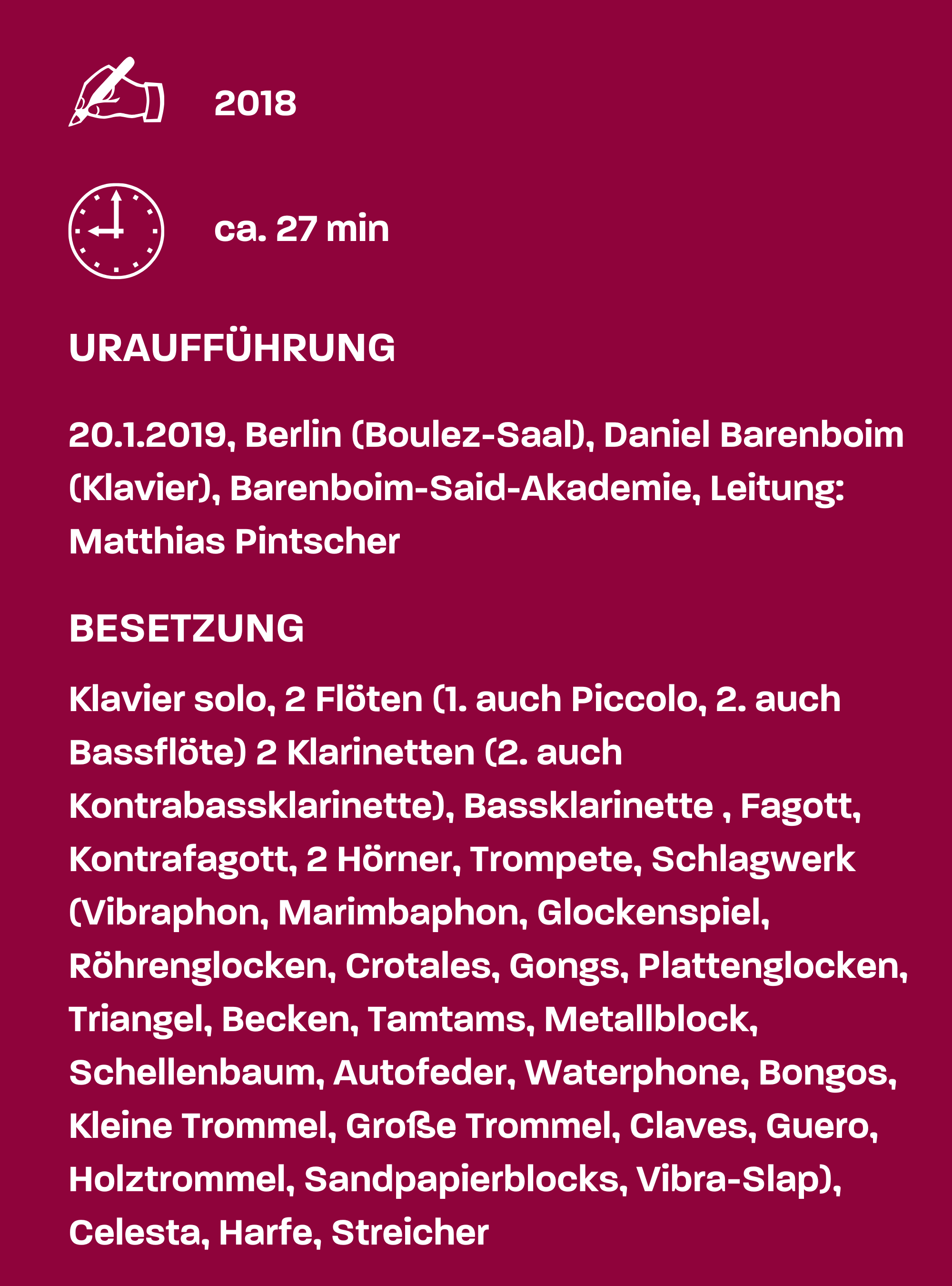 Matthias Pintscher sträubte sich lange dagegen, ein Klavierkonzert zu schreiben – zu auserzählt, gar abgegriffen erschien ihm die Gattung. Dieses Sträuben scheint dem Beginn von NUR einbeschrieben zu sein; man hat den Eindruck, dass das Solo seine Hauptrolle nur zögerlich annimmt. Dann allerdings streift der Klavierpart seine anfänglich kontemplative Haltung ab und steigert sich in einen feurigen Wettkampf – ganz im Sinne der Gattungstradition – mit den übrigen Instrumenten, die im Prozess zu Dialogpartnern des Klaviers werden – auch das ein Kernbestandteil der Konzertform. Dafür, dass diese Vielstimmigkeit nicht in Sprachverwirrung ausartet, sorgt Pintscher mit gleichermaßen souveräner Kompositionstechnik wie mit dramaturgischem Gespür: Der melancholische Hornruf, der das Stück eröffnet, ist in seiner Intervallstruktur zugleich die Keimzelle für ausgreifende melodische Linien, die im Grunde dem ganzen Werk als Gerüst dienen und sich gerade ob ihrer Zartheit in fein austarierten, subtil umspielten Varianten immer wieder gegen ihren Gegenpart, schroffe Gruppen- oder Tuttigesten, zu behaupten vermögen. Dem Reichtum und der Brillanz der Texturen liegt also ein durchaus ökonomisches Denken zugrunde. Dieser Wechsel der Grundgestik zwischen monologisch-solistischer Kontemplation und kollektivem Dreinfahren bildet sich in der Großform ab: Der Mittelsatz stellt einen Pol gespannter Ruhe dar, zu dem das Finale – „erratisch, mit Härte“ überschrieben – einen denkbar großen Kontrast bildet.