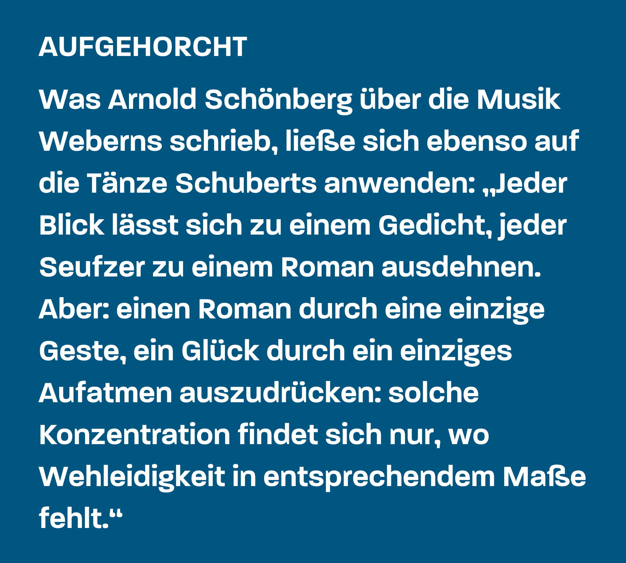 Franz Schubert komponierte mehrere Hundert solcher kurzen Tänze, überwiegend Ländler, von denen er gut die Hälfte auch drucken ließ. Das zeigt, dass er diesen Miniaturen, die zum großen Teil für die Wiener Karnevalssaisons entstanden, durchaus künstlerischen Wert beimaß. Doch darf dabei der ganz praktische Aspekt nicht unterschlagen werden, dass diese Tänze eine der wenigen halbwegs stetigen Einkommensquellen für den zeitlebens in prekären Verhältnissen lebenden Schubert bedeuteten. Die sechs Tänze, die Anton Webern im Auftrag der Universal Edition für ein Orchester in klassischer Besetzung instrumentierte, wurden zu Schuberts Lebzeiten nicht veröffentlicht. Das schmälert jedoch nicht ihren Charme: Jeder der Tänze enthält sein individuelles Glanzlicht, das ihn von bloßer Gebrauchsmusik abhebt – sei es ein kurzer Ausflug in entfernte Tonarten (Nr. 1) oder eine Verschiebung des rhythmischen Akzents, die den Dreivierteltakt wie einen Zweivierteltakt klingen lässt (Nr. 4). Vor allem aber überrascht die häufige Abschattierung ins Pianissimo (Nr. 2, 3, 5 und 6), die an alles andere als an einen unter Paaren im Ländlertaumel donnernden Tanzboden denken lässt.