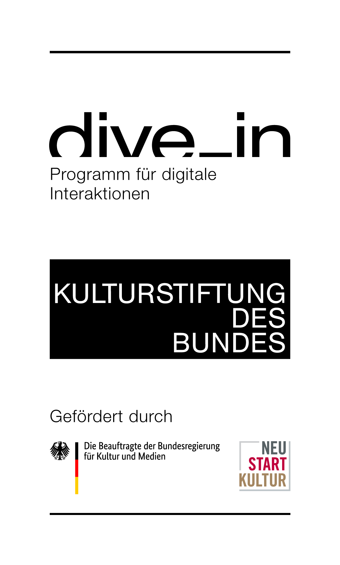 Das Projekt wird entwickelt im Rahmen von „dive in. Programm für digitale Interaktionen“ der Kulturstiftung des Bundes, gefördert durch die Beauftragte der Bundesregierung für Kultur und Medien (BKM) im Programm NEUSTART KULTUR.