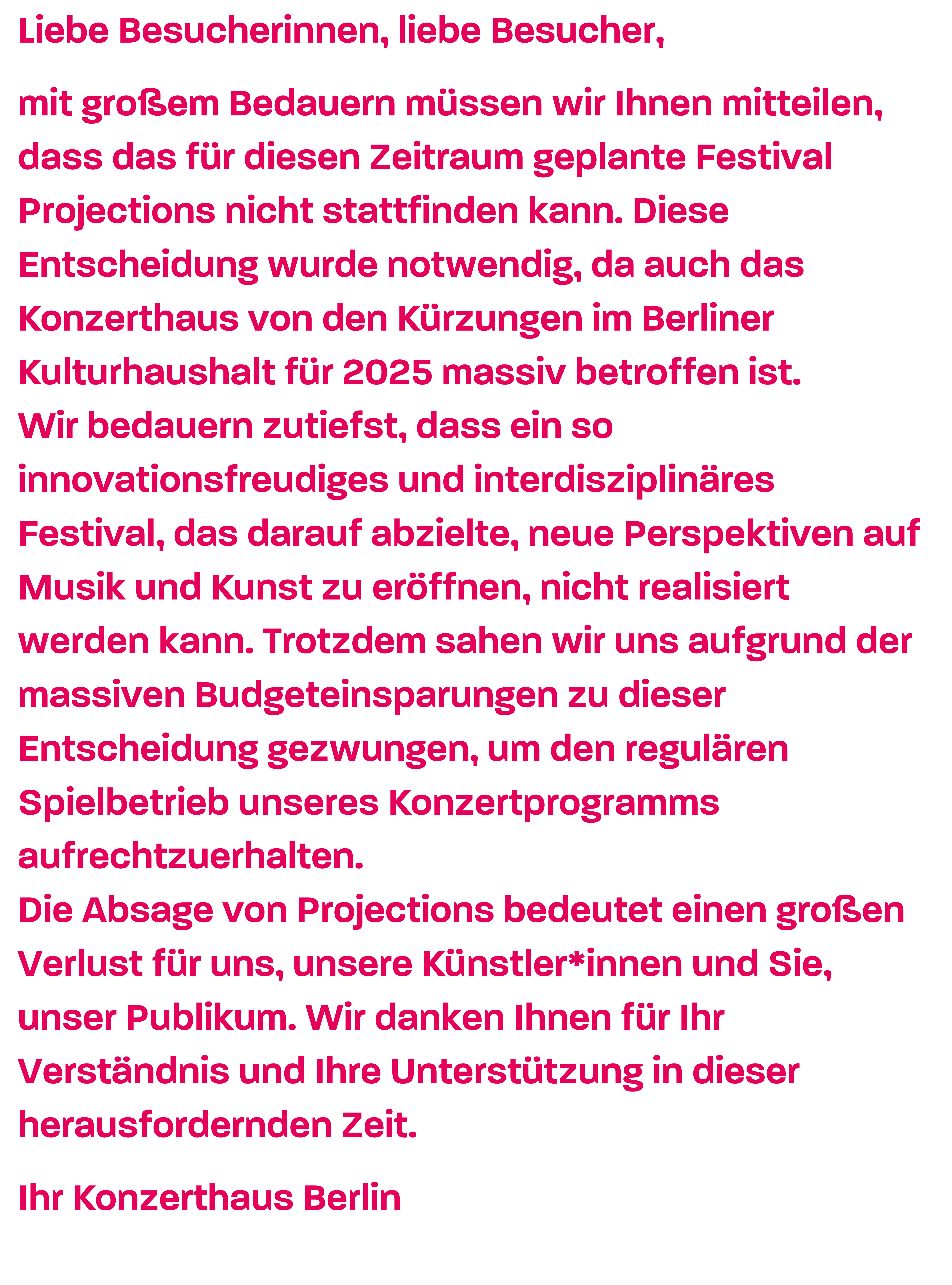 Für frische Synapsen im Kopf und das nötige Seelenfutter am Ende des Winters sorgt das Festival „Projections“. Im Februar wird es zur Leinwand für neue Ideen und kombiniert Musik mit Licht, Farben, Formen und Visionen. Mit dieser starken Verbindung überträgt das Konzerthaus Berlin eine alte Diskussion in die Gegenwart: Braucht die Musik einen außermusikalischen Verbündeten? In der visuellen Welt des 21. Jahrhundert sollte es immer wieder ausprobiert werden – jedenfalls, wenn daraus so raffinierte, synästhetisch inspirierende Konzerte resultieren wie bei „Projections“.