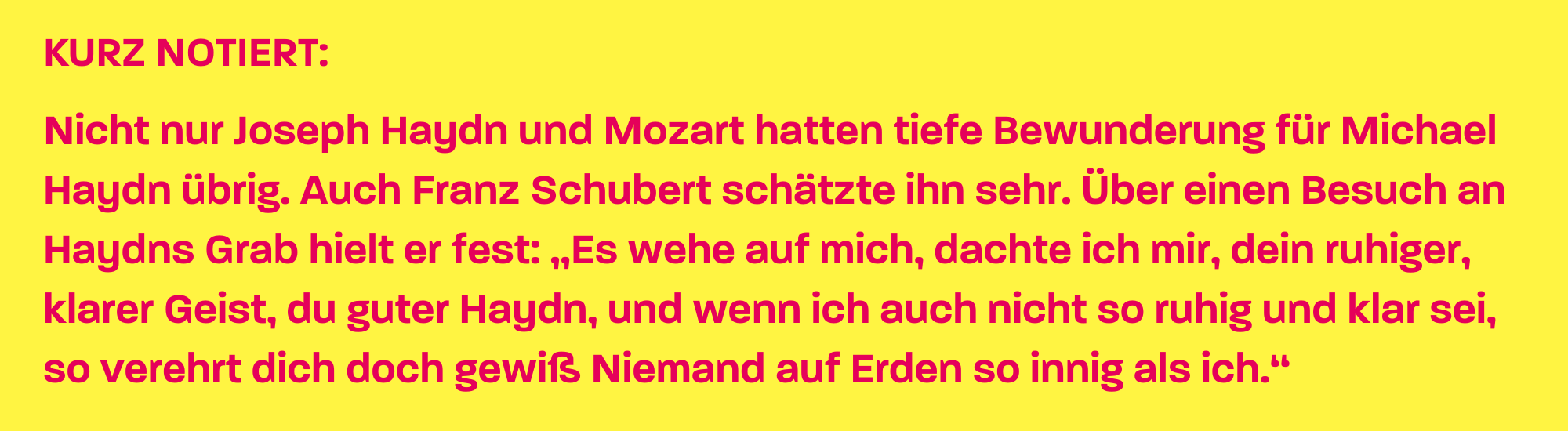 Mit seinem großen Bruder Joseph verband Michael Haydn eine innige, wechselseitig bewundernde Beziehung, auch wenn die beiden sich nicht oft sahen. Ein Angebot, wie sein Bruder eine Stelle beim Fürsten Esterházy anzunehmen, schlug Michael Haydn aus, zu sehr hing er an seiner Wahlheimat Salzburg. Er starb auch dort, im Jahr 1806, während seiner Arbeit an einem Requiem – die letzte Parallele zu Mozart. Haydns Beerdigung war eine der größten Begräbnisfeiern der Stadt.