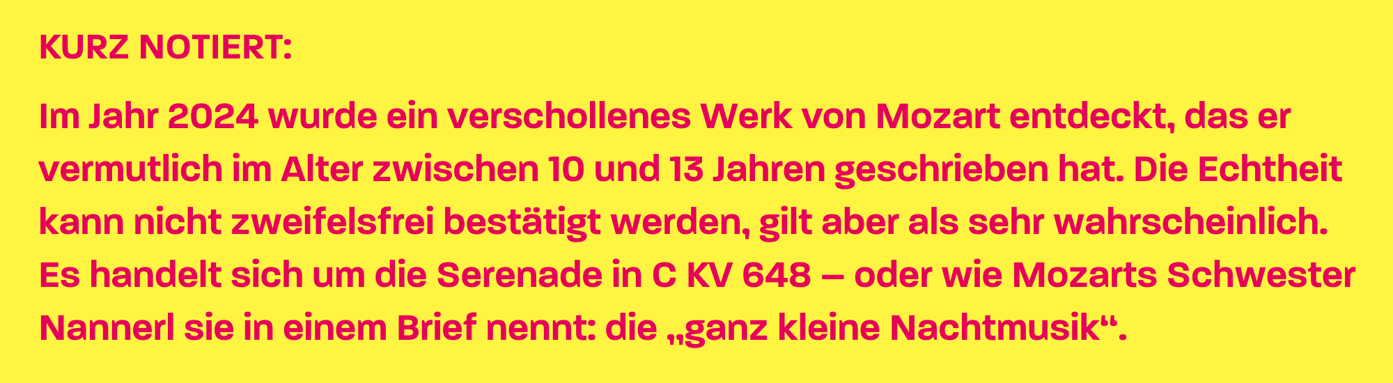 Ein Stück ohne großen Aufwand, mal eben so zwischen zwei Akten zu Papier gebracht – Mozart könnte wahrscheinlich selbst nicht glauben, dass seine Serenade heute eines der populärsten Stücke überhaupt ist. Denn wir wissen nicht, ob das Stück überhaupt zu seinen Lebzeiten aufgeführt wurde. Erstmals gedruckt wurde es 1827, lange nach Mozarts Tod – und so beliebt wie heute war es auch lange Zeit nicht. Neben dem unbekannten Kompositionsanlass gibt es noch viele weitere ungeklärte Fragen. So hat das Stück laut Mozarts Eintragung im Werkverzeichnis eigentlich fünf Sätze – ein Menuett, das an zweiter Stelle stehen sollte, ist verschollen. Auch ist völlig unklar, wieso Mozart überhaupt eine Serenade für Streicher komponiert hat, da die Gattung zu der Zeit nahezu ausschließlich Bläserensembles vorbehalten war. Die kleine Nachtmusik fasziniert heute nicht nur Hörer*innen weltweit, sondern hält auch verlässlich die Musikwissenschaft auf Trab.