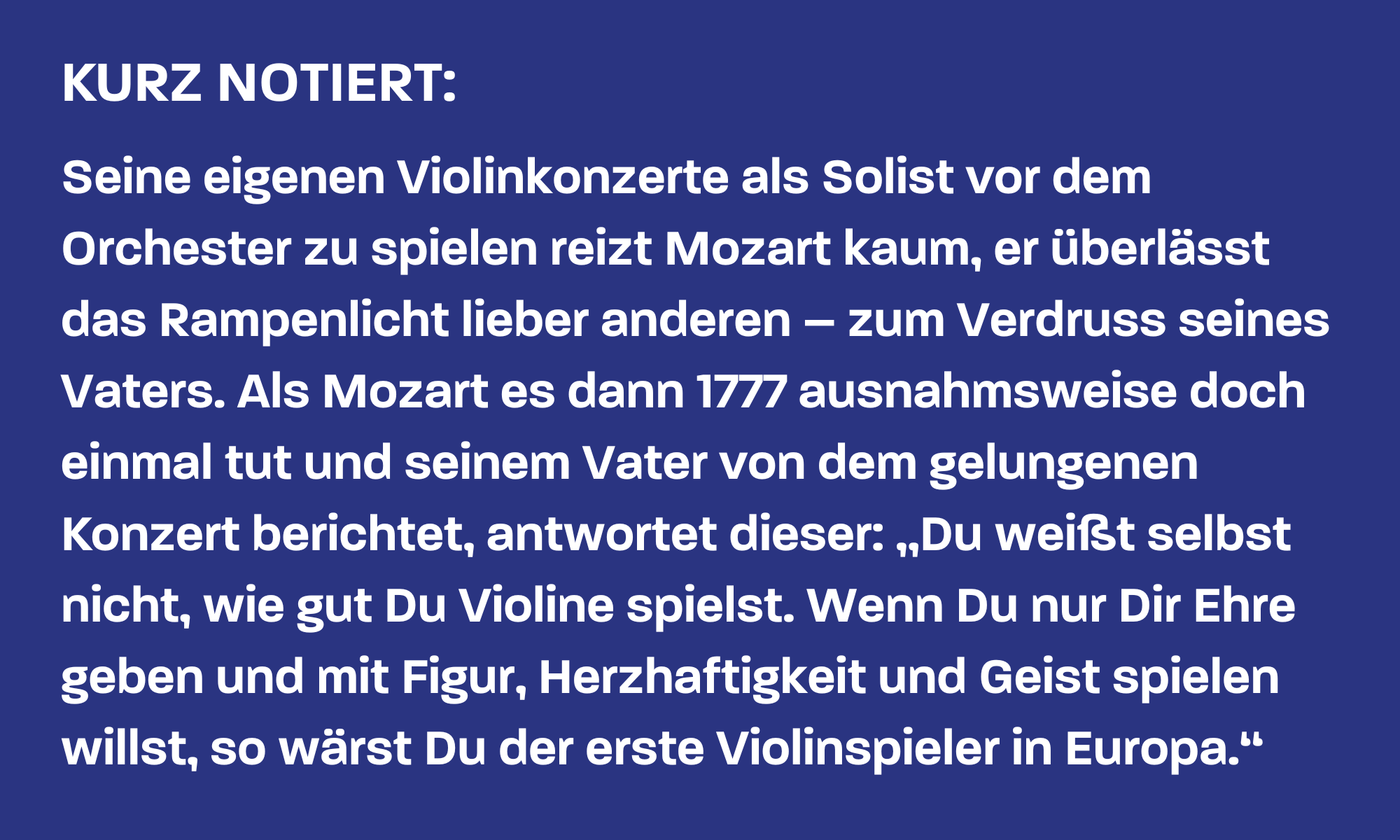 Das Violinkonzert in B-Dur ist nicht nur das erste von fünf Violinkonzerten, sondern auch Mozarts erster Gehversuch auf dem Terrain der Instrumentalkonzerte überhaupt. Während sein Fokus später auf anderen Instrumenten liegt – wie nicht zuletzt 23 Klavierkonzerte beweisen – ist der damals siebzehnjährige Mozart ein Geiger durch und durch. Die italienische Violinpraxis des 18. Jahrhunderts, geprägt durch Antonio Vivaldi und Luigi Boccherini, muss Mozart sehr beeindruckt haben. Jedenfalls komponiert er direkt nach seiner Rückkehr aus dem Süden ein Violinkonzert, das viele Gestaltungselemente der italienischen Meister aufweist.