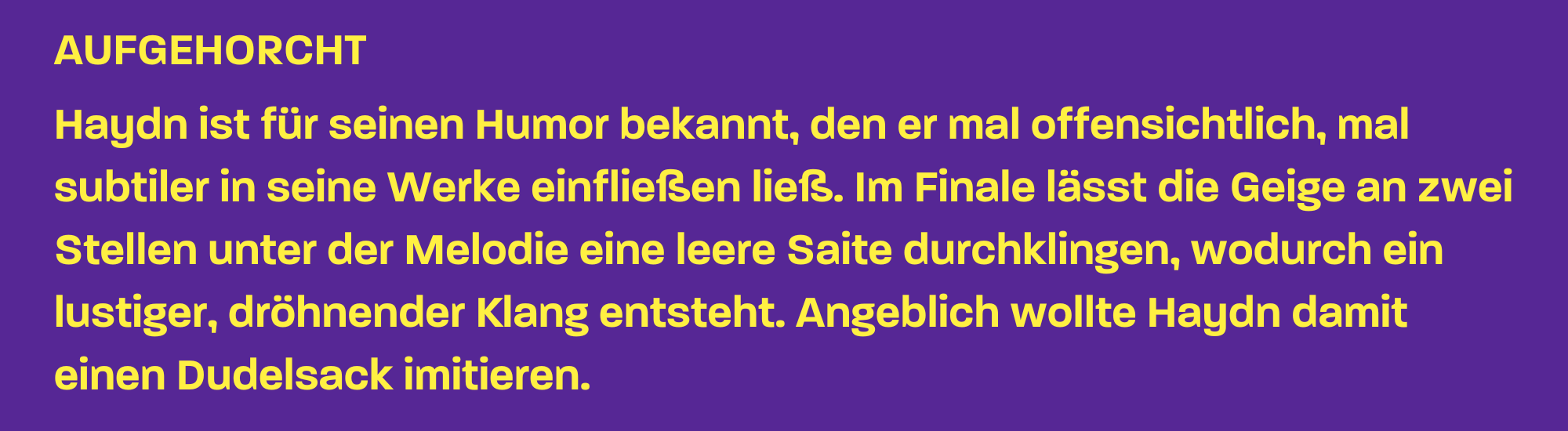 Sein Violinkonzert G-Dur wird in der Regel als Nr. 4 gelistet und häufig auf 1769 datiert. Andere Musikwissenschaftler*innen zweifeln dies jedoch an und vermuten, dass es viel früher entstanden sein muss, nämlich noch vor Haydns Esterházy-Periode. Dafür spricht vor allem, dass es im Vergleich zu den anderen Konzerten deutlich simpler und altmodischer erscheint und der Fokus mehr auf Gesanglichkeit als auf Virtuosität liegt – einem Spitzengeiger wie Tomasini möglicherweise nicht ausreichend. Darüber hinaus gibt es sogar Zweifel, ob das Stück überhaupt von Haydn stammt oder nicht etwa von Leopold Hofmann. Dessen Flötenkonzert wurde wiederum lange Haydn zugeschrieben – Musikwissenschaft kann wirklich verwirrend sein.