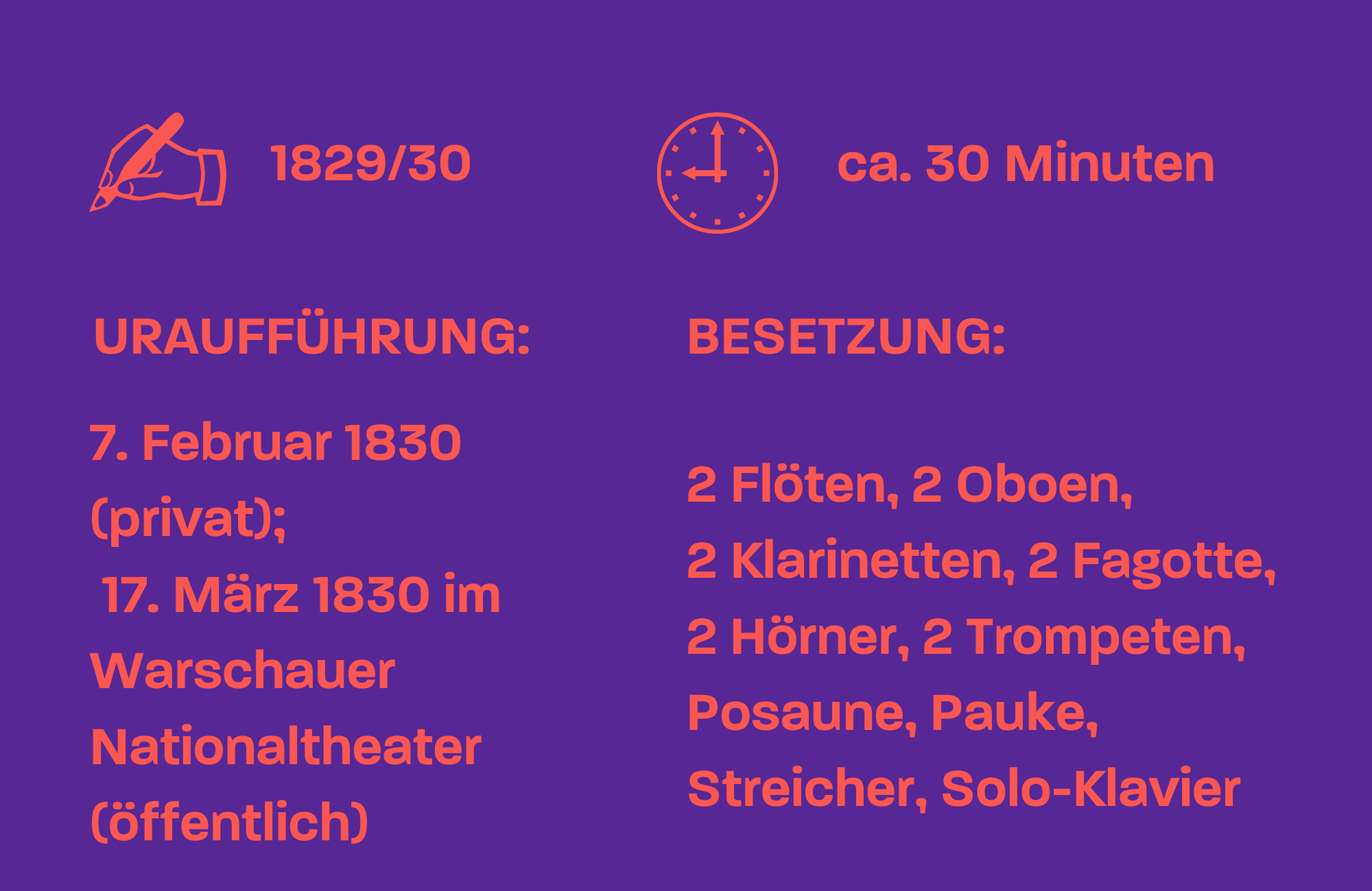 Im Juli 1829 reiste Fryderyk Chopin aus Warschau über Krakau nach Wien – mit einem Koffer voller Noten und ziemlich gemischten Gefühlen zwischen Zuversicht und Lampenfieber. Die Musikmetropole sollte nämlich ein Sprungbrett zur internationalen Karriere des damals 19-Jährigen werden, der (obwohl er sein Musikstudium gerade erst beendet hatte) in seiner polnischen Heimat bereits als Klaviervirtuose gefeiert wurde. Chopin gab zwei öffentliche Konzerte, mit euphorischen Reaktionen bei Publikum und Presse. Seiner Familie nach Warschau berichtete er mit Understatement, er sei „nicht ausgepfiffen“ worden.Im gleichen Sommer begann Chopin mit der Komposition seines ersten Klavierkonzerts f-Moll – noch vor dem später als Nummer eins gezählten e-Moll-Konzert, das die niedrigere Opuszahl 11 nur aufgrund der früheren Drucklegung erhielt.