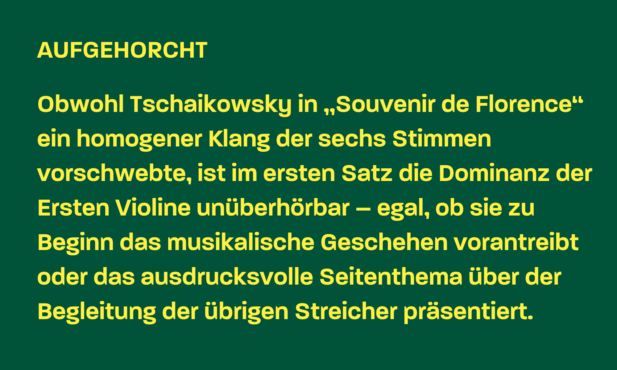 Das Streichsextett d-Moll op. 70 mit dem etwas irreführenden Titel „Souvenir de Florence“ ist das letzte größere Werk, das Pjotr Tschaikowsky vor seiner Sechsten Sinfonie geschrieben hat – nicht in Italien, sondern auf seinem südlich von Klin gelegenen Gut Frolowskoje: keine „italienische“, sondern russische Musik, die in den ersten Takten ohne Vorwarnung und mit geradezu orchestraler Wucht über die Hörer hereinbricht. Der Komponist hatte das Werk nur deshalb mit seinem Italienaufenthalt in Verbindung gebracht, weil ihm im Frühjahr 1890 das Hauptthema des langsamen Satzes in Florenz eingefallen war – während er an seiner Oper „Pique Dame“ arbeitete. Tschaikowsky komponierte das viersätzige Sextett, das heute in der Version für Streichorchester erklingt, weil er sich noch für die Ernennung zum Ehrenmitglied der St. Petersburger Kaiserlichen Kammermusikgesellschaft im Jahr 1886 bedanken wollte – kein leichtes Unterfangen, wie er gegenüber seinem Bruder Modest bekannte: „Schwierigkeiten bereitet mir nicht der Mangel an Ideen, sondern die Neuheit der Form. Es sind sechs selbstständige und dabei gleichwertige Stimmen nötig. Das ist unwahrscheinlich schwierig. Haydn konnte diese Problematik nicht überwinden. Außer für Quartett schrieb er keine derartige Kammermusik.“ Tschaikowsky gelang es schließlich, alle Hürden zu überwinden und in erstaunlich kurzer Zeit, ein echtes Meisterwerk zu schreiben: ein Stück, das an keiner Stelle „gearbeitet“ wirkt und die Möglichkeiten der Sechserbesetzung raffiniert und in allen Facetten ausschöpft.