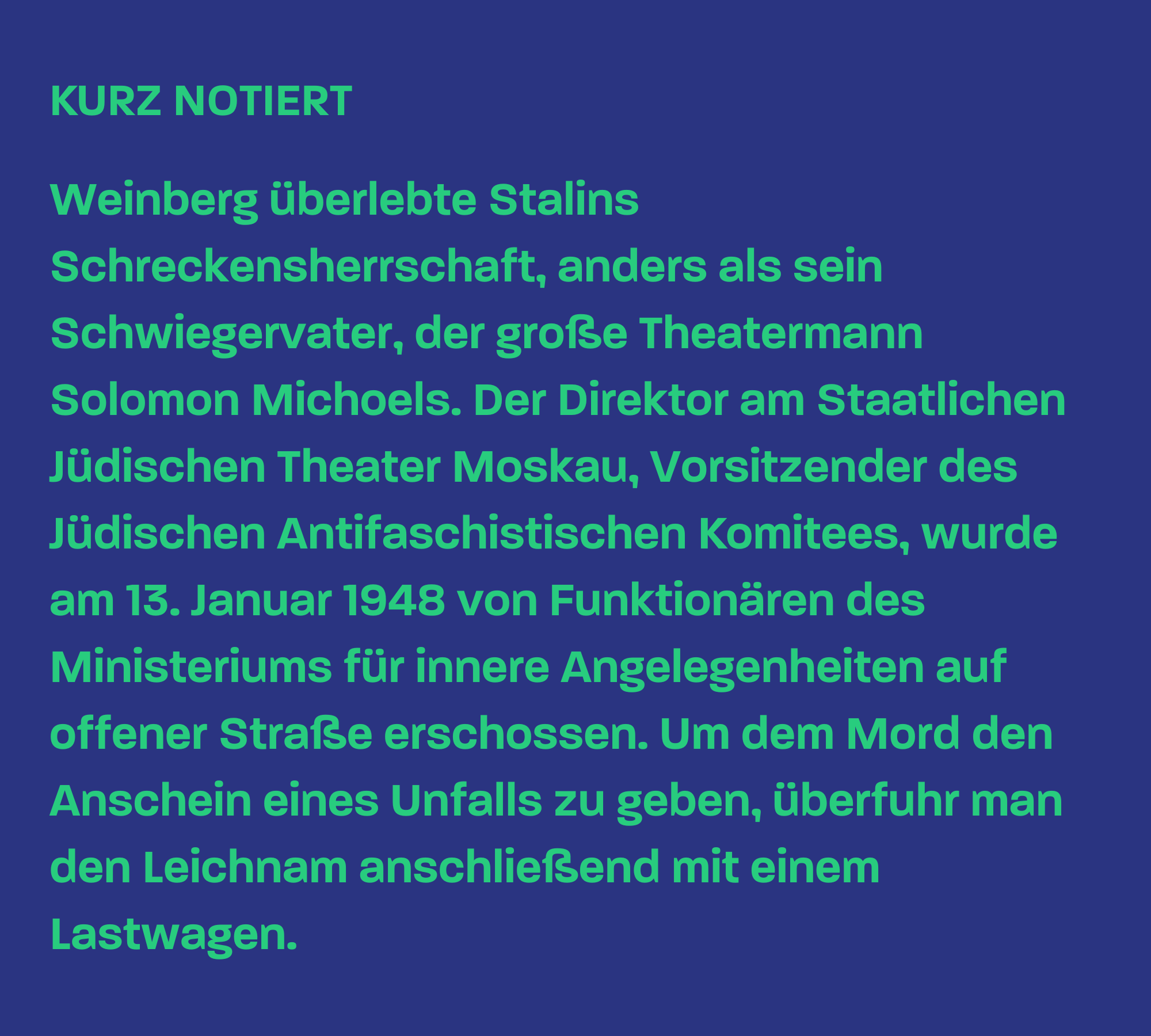 Als Hitler-Deutschland Polen am 1. September 1939 überfiel, ergriff Mieczysław Weinberg sofort die Flucht. Der junge Musikstudent, der gerade noch sein Pianisten-Examen am Warschauer Konservatorium hatte absolvieren können, ging zu Fuß in Richtung Osten, da die deutsche Wehrmacht das Land von Westen und Süden aus überrannte – Geld für eine Schiffspassage hatte der damals 19-Jährige nicht. Seine Familie, die Eltern und seine zwei Jahre jüngere Schwester, wurde kurze Zeit später in Warschau ermordet. Weinberg setzte sich nach Minsk ab – weil er Jude war, verpasste man ihm in seinen sowjetischen Papieren den Vornamen „Moisej“ –, wo er bei Wassilij Solotarjow, einem Schüler Balakirews und Rimsky-Korsakows, Komposition studierte. 1941, als Hitlers Truppen auf breiter Front zwischen Ostsee und Karpaten im „Unternehmen Barbarossa“ die Sowjetunion überfielen, musste er erneut vor der deutschen Wehrmacht fliehen – diesmal ins ferne Usbekistan, wo er in Taschkent als Korrepetitor an der Oper arbeitete. Dmitri Schostakowitsch, beeindruckt von Weinbergs Erster Sinfonie, sorgte persönlich dafür, dass dieser eine Aufenthaltsgenehmigung für Moskau erhielt.