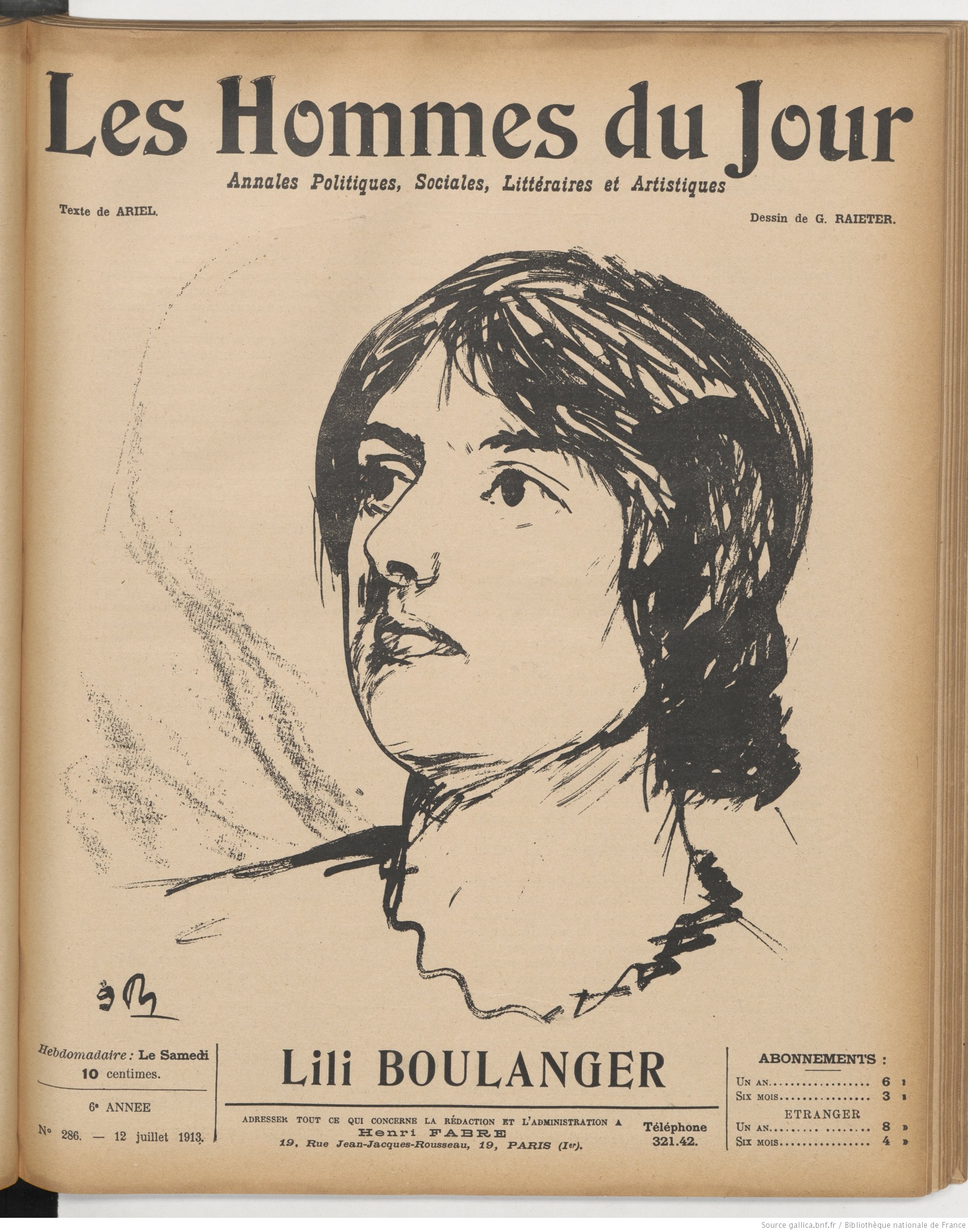 Bereits sehr früh war das außergewöhnliche Talent Lili Boulangers – in Paris geboren als Tochter einer Sängerin und eines Komponisten sowie als jüngere Schwester der später in aller Welt als Lehrerin geschätzten Nadia – aufgefallen. Mit dem Gewinn des begehrten Kompositionspreises „Prix de Rome“ 1913 wurde sie dann geradezu zur Berühmtheit, denn seit Beginn des 19. Jahrhunderts hatten sich Generationen von französischen Komponisten um diese Ehrung, die mit einem Studienaufenthalt in der römischen Villa Medici verbunden war, gerissen.