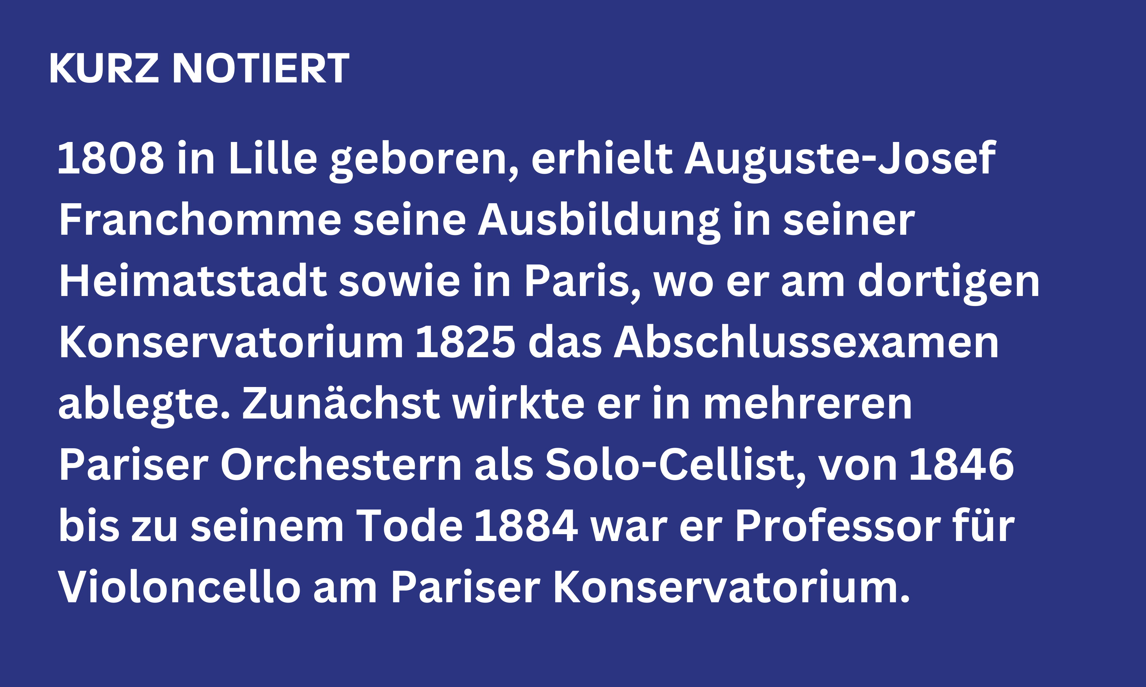 Chopins Kammermusikpartner am Violoncello war jedoch erste Wahl: Für den Pariser Cellisten Auguste Franchomme entstanden sowohl die Cellosonate g-Moll op. 65 als auch das Grand Duo concertant, letzteres sogar als Gemeinschaftskomposition der beiden Künstler.